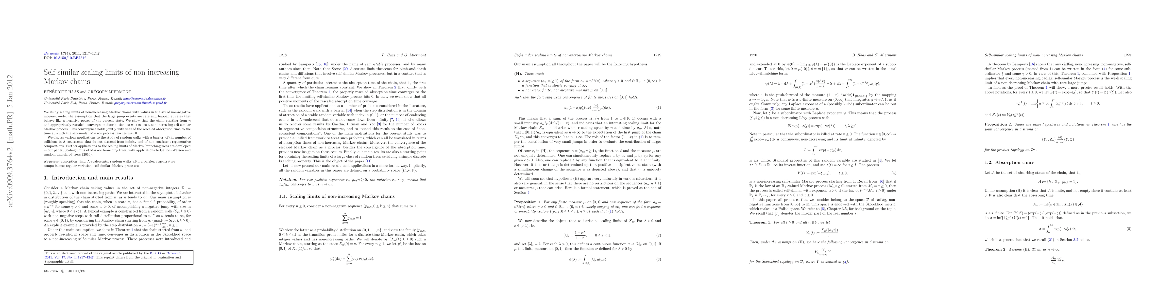 This paper investigates the scaling limits of non-increasing Markov chains, demonstrating that they converge to a self-similar Markov process as the initial state grows large. The study also extends to applications involving random walks with barriers and coalescent processes.