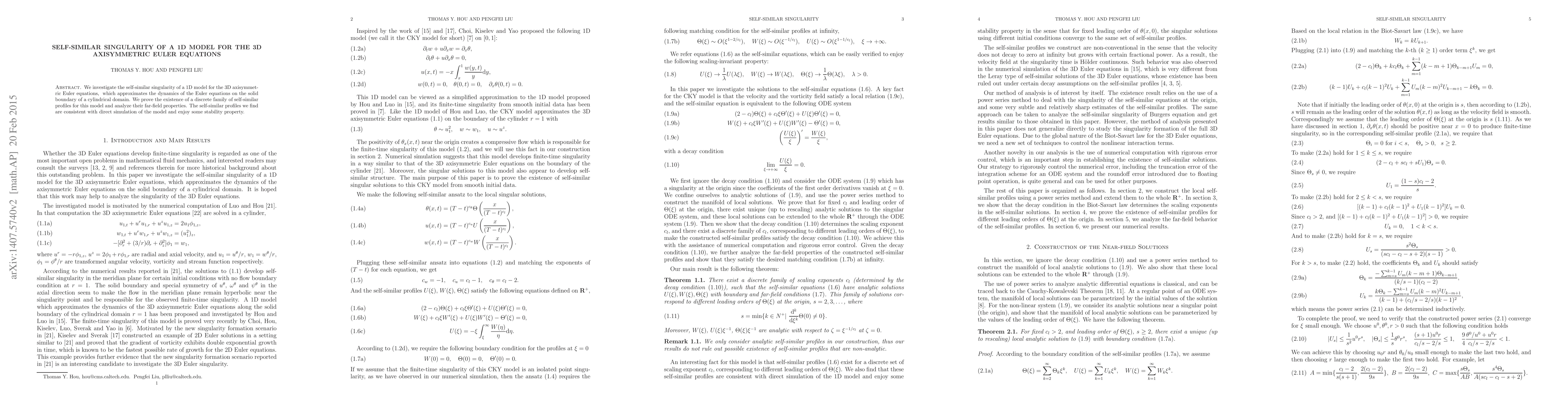 This paper investigates the self-similar singularity in a 1D model for the 3D axisymmetric Euler equations, proving the existence of a discrete family of self-similar profiles and analyzing their stability and far-field properties. The findings align with numerical simulations and suggest potential stability.