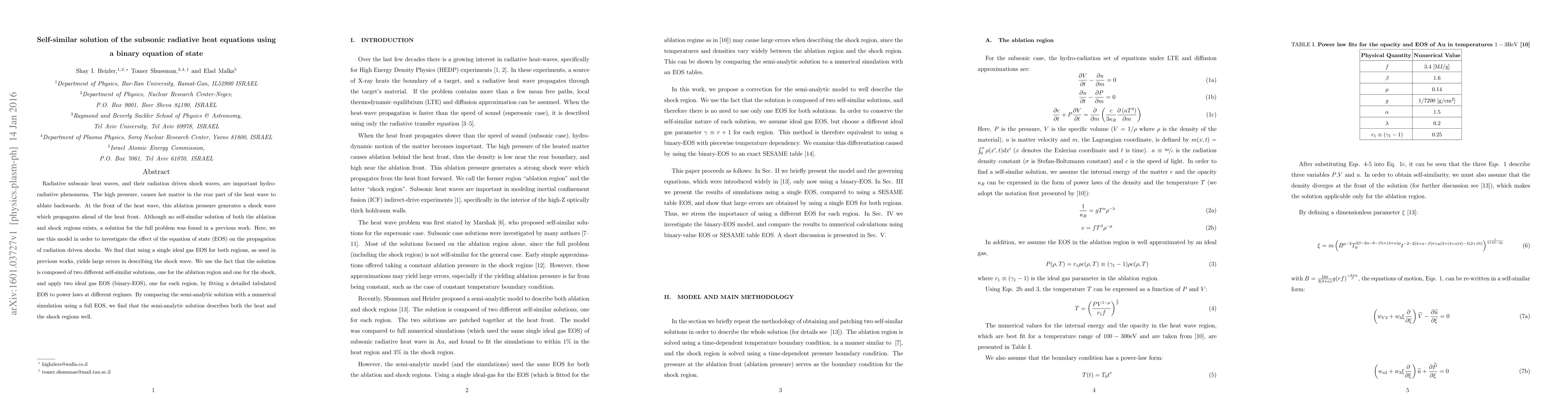 This paper presents a self-similar solution for radiative subsonic heat waves and their shock waves, employing a binary equation of state (EOS) to improve accuracy. It finds that using a single EOS leads to significant errors, while a dual EOS approach provides a more precise description of both ablation and shock regions.