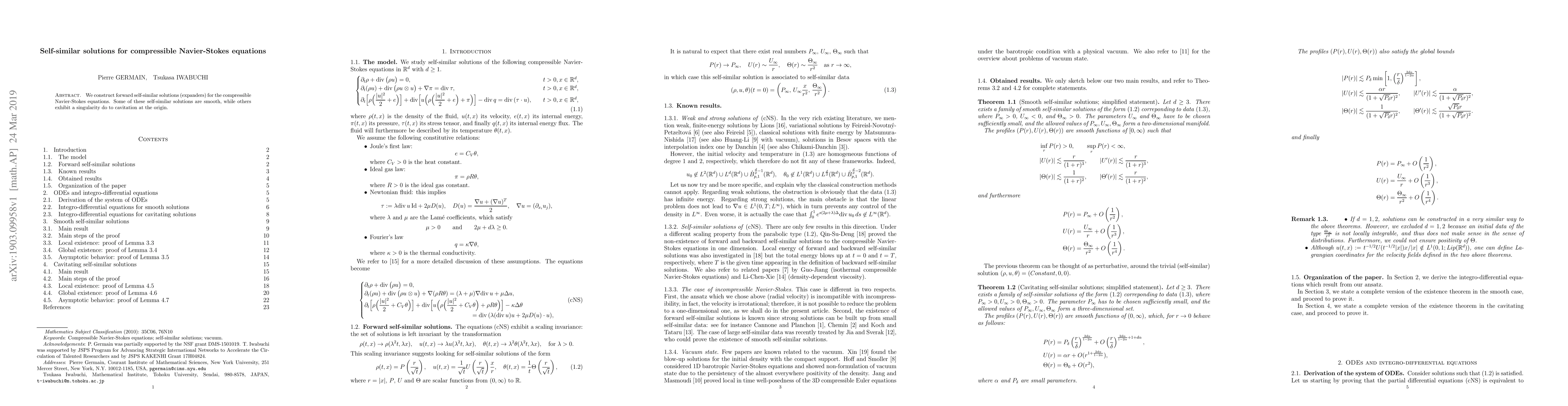 Summary: This paper constructs self-similar solutions for the compressible Navier-Stokes equations, identifying both smooth and singular (cavitation-induced) cases. The study highlights the diverse behaviors of these solutions under self-similarity.