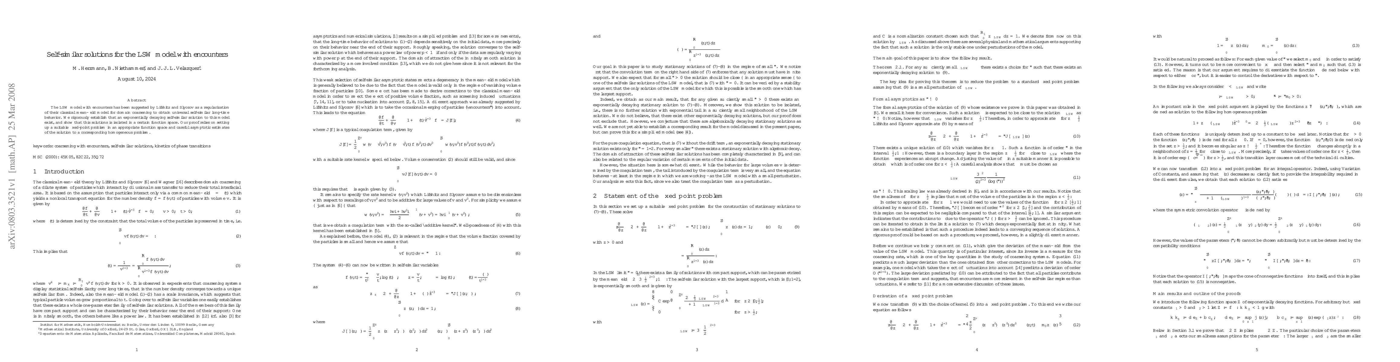 The LSW model with encounters has been suggested by Lifshitz and Slyozov as a regularization of their classical mean-field model for domain coarsening to obtain universal self-similar long-time behavior. We rigorously establish that an exponentially decaying self-similar solution to this model exist, and show that this solutions is isolated in a certain function space. Our proof relies on setting up a suitable fixed-point problem in an appropriate function space and careful asymptotic estimates of the solution to a corresponding homogeneous problem.
