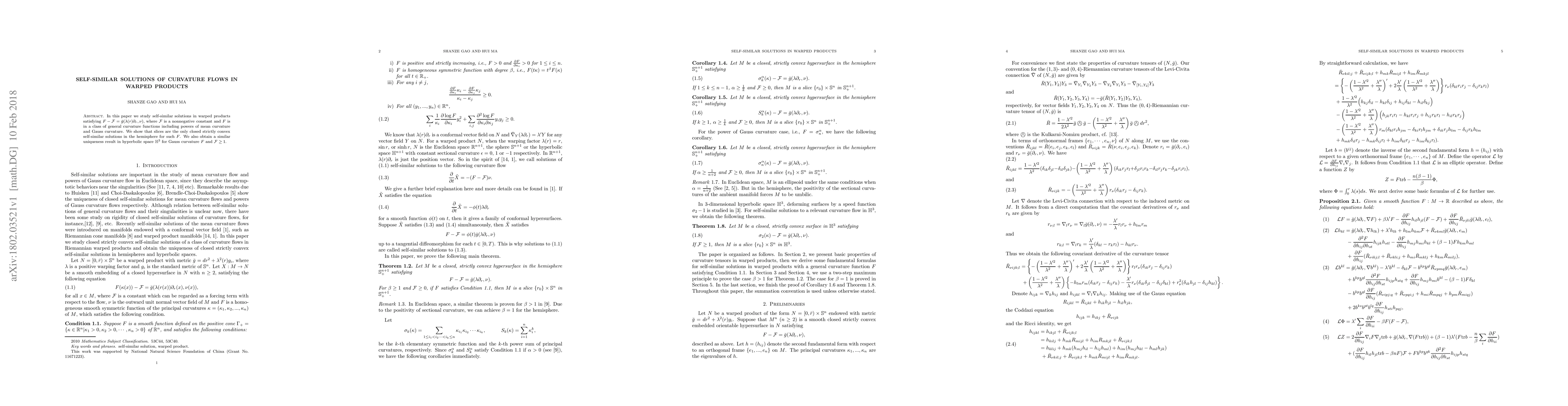 The paper studies self-similar solutions in warped products for curvature flows, focusing on equations involving general curvature functions including powers of mean curvature and Gauss curvature.