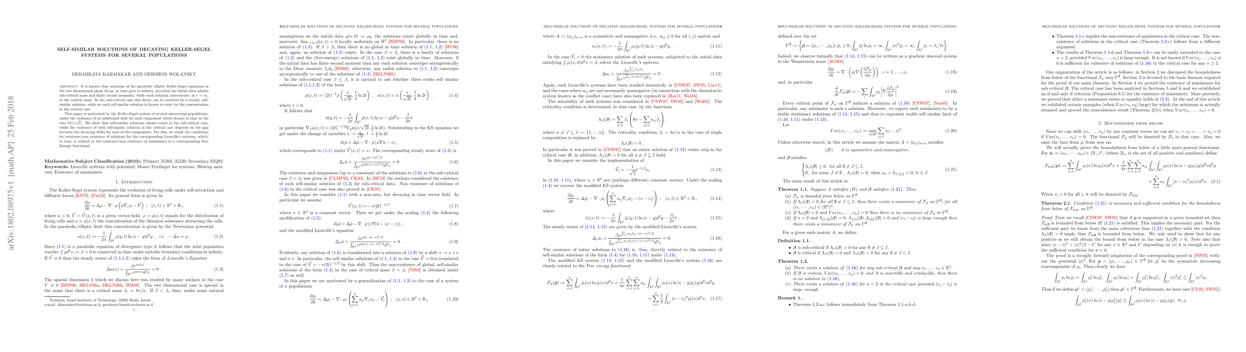 It is known that solutions of the parabolic elliptic Keller-Segel equations in the two dimensional plane decay, as time goes to infinity, provided the initial data admits sub-critical mass and finite second moments, while such solution concentrate, as $t\rightarrow\infty$, in the critical mass. In the sub-critical case this decay can be resolved by a steady, self-similar solution, while no such self similar solution is known to exist for the concentration in the critical case. This paper is motivated by the Keller-Segel system of several interacting populations, under the existence of an additional drift for each component which decays in time at the rate $O(1/\sqrt{t})$. We show that self-similar solutions always exists in the sub-critical case, while the existence of such self-similar solution in the critical case depends on the gap between the decaying drifts for each of the components. For this, we study the conditions for existence/non existence of solutions for the corresponding Liouville's systems, which, in turn, is related to the existence/non existence of minimizers to a corresponding Free Energy functional.