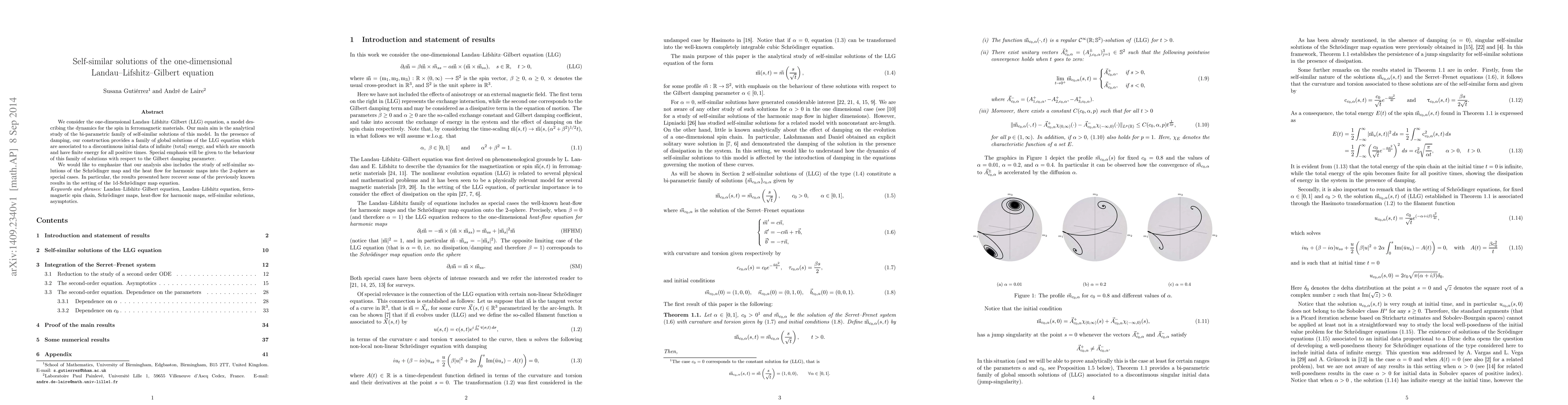 We consider the one-dimensional Landau-Lifshitz-Gilbert (LLG) equation, a model describing the dynamics for the spin in ferromagnetic materials. Our main aim is the analytical study of the bi-parametric family of self-similar solutions of this model. In the presence of damping, our construction provides a family of global solutions of the LLG equation which are associated to a discontinuous initial data of infinite (total) energy, and which are smooth and have finite energy for all positive times. Special emphasis will be given to the behaviour of this family of solutions with respect to the Gilbert damping parameter. We would like to emphasize that our analysis also includes the study of self-similar solutions of the Schr\"odinger map and the heat flow for harmonic maps into the 2-sphere as special cases. In particular, the results presented here recover some of the previously known results in the setting of the 1d-Schr\"odinger map equation.
