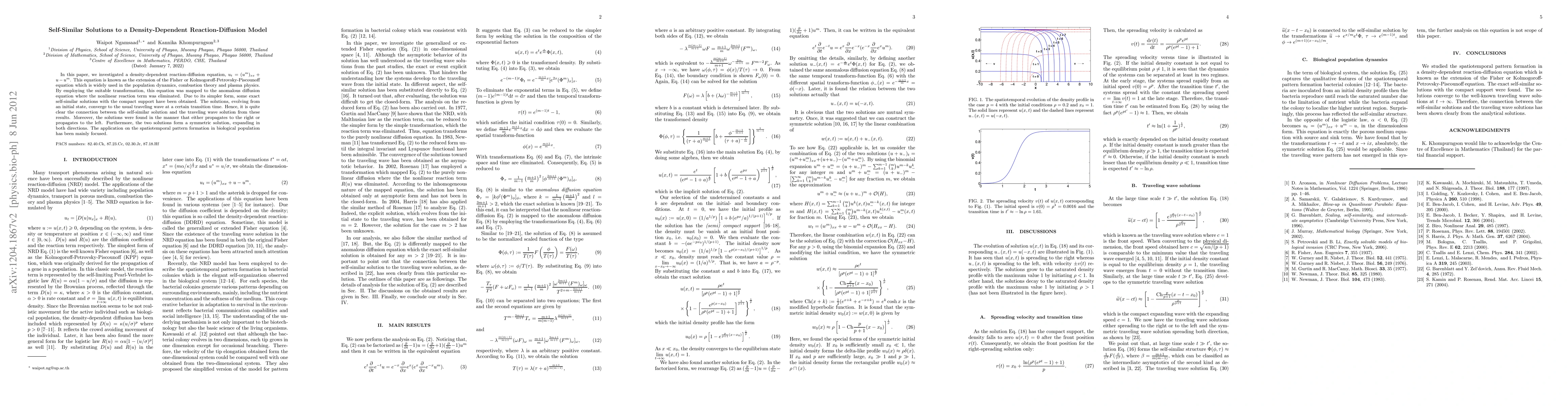 This paper explores self-similar solutions to a density-dependent reaction-diffusion equation, transforming it into an anomalous diffusion equation to derive exact solutions with compact support. The solutions exhibit symmetric behavior, converging to traveling waves, and are applied to spatiotemporal pattern formation in biological populations.