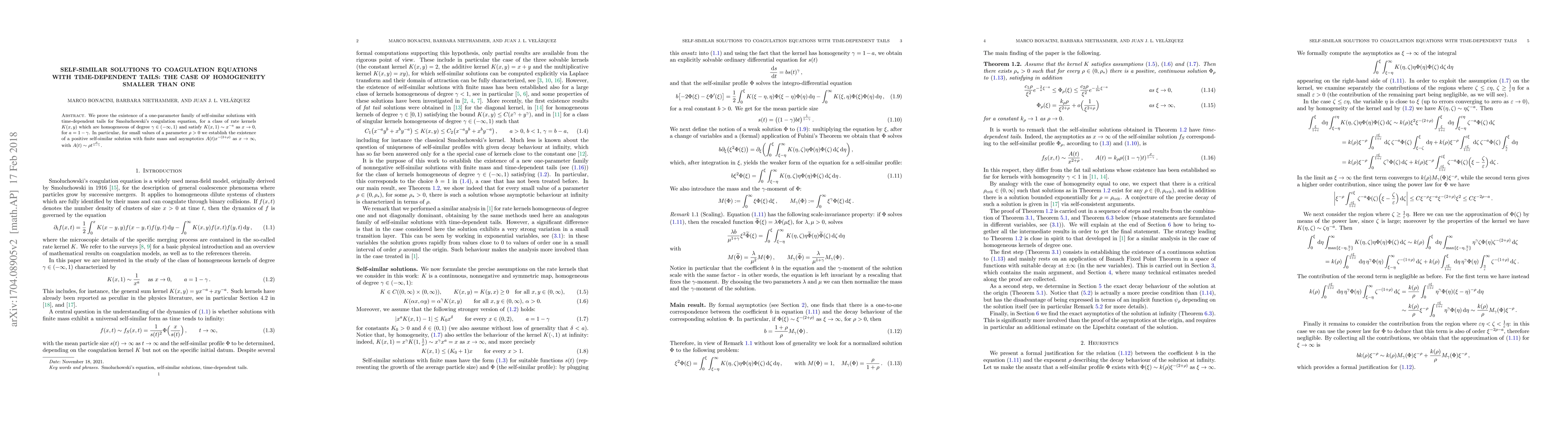 We prove the existence of a one-parameter family of self-similar solutions with time-dependent tails for Smoluchowski's coagulation equation, for a class of rate kernels $K(x,y)$ which are homogeneous of degree $\gamma\in(-\infty,1)$ and satisfy $K(x,1)\sim x^{-a}$ as $x\to 0$, for $a=1-\gamma$. In particular, for small values of a parameter $\rho>0$ we establish the existence of a positive self-similar solution with finite mass and asymptotics $A(t)x^{-(2+\rho)}$ as $x\to\infty$, with $A(t)\sim\rho t^\frac{\rho}{1-\gamma}$.