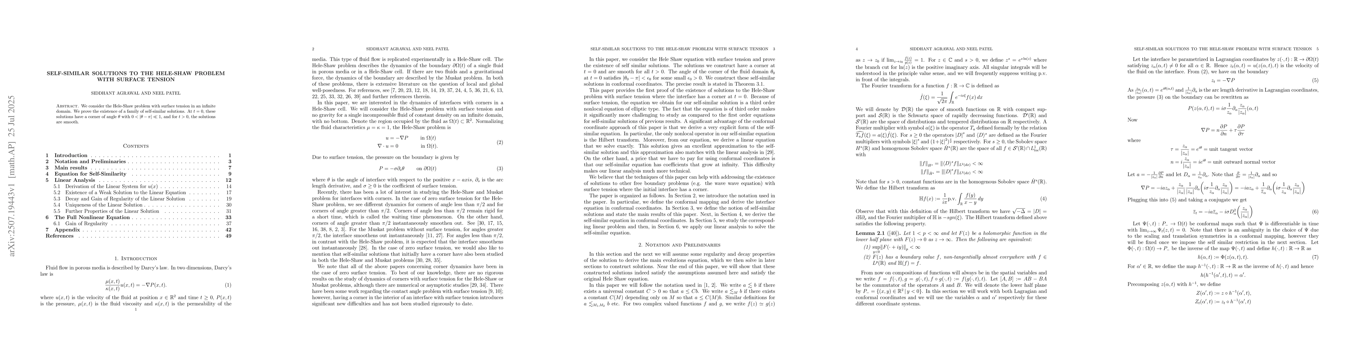 We consider the Hele-Shaw problem with surface tension in an infinite domain. We prove the existence of a family of self-similar solutions. At $t=0$, these solutions have a corner of angle $\theta$ with $ 0 < |\theta - \pi| \ll 1$, and for $t>0$, the solutions are smooth.