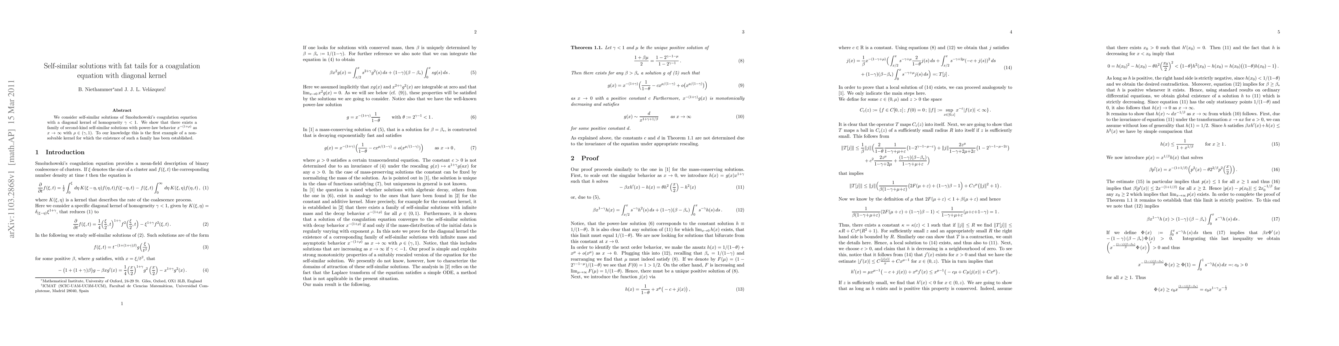 This paper investigates self-similar solutions of Smoluchowski's coagulation equation with a diagonal kernel of homogeneity $\gamma < 1$, revealing a family of second-kind solutions with power-law behavior $x^{-(1+\rho)}$ as $x \to \infty$ for $\rho \in (\gamma,1)$. This is the first instance where such solutions exist for a non-solvable kernel.