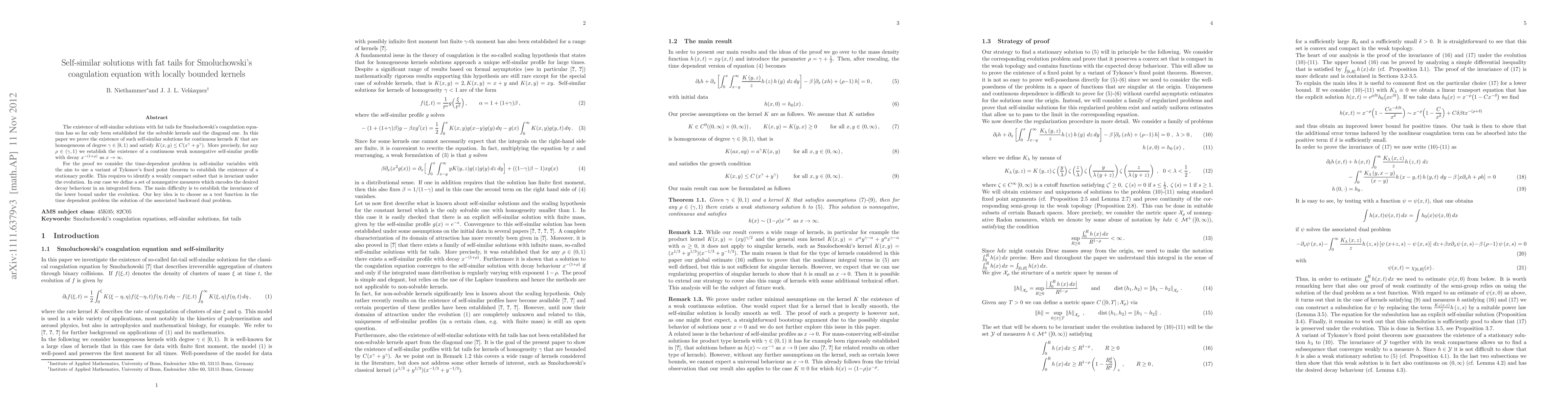 This paper proves the existence of self-similar solutions with fat tails for Smoluchowski's coagulation equation under locally bounded kernels that are homogeneous of degree $\gamma \in [0,1)$. It establishes continuous weak self-similar profiles with decay $x^{-(1+\rho)}$ for $\rho \in (\gamma,1)$.