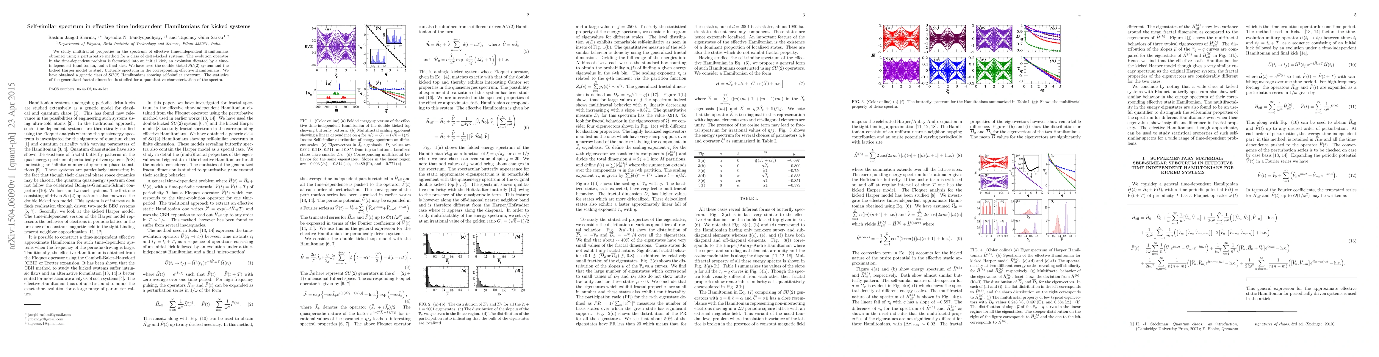 This paper investigates multifractal properties in the spectrum of effective time-independent Hamiltonians derived from delta-kicked systems, focusing on the double kicked $SU(2)$ system and the kicked Harper model. It reveals a self-similar spectrum in a generic class of $SU(2)$ Hamiltonians and quantitatively characterizes the spectra using the statistics of the generalized fractal dimension.