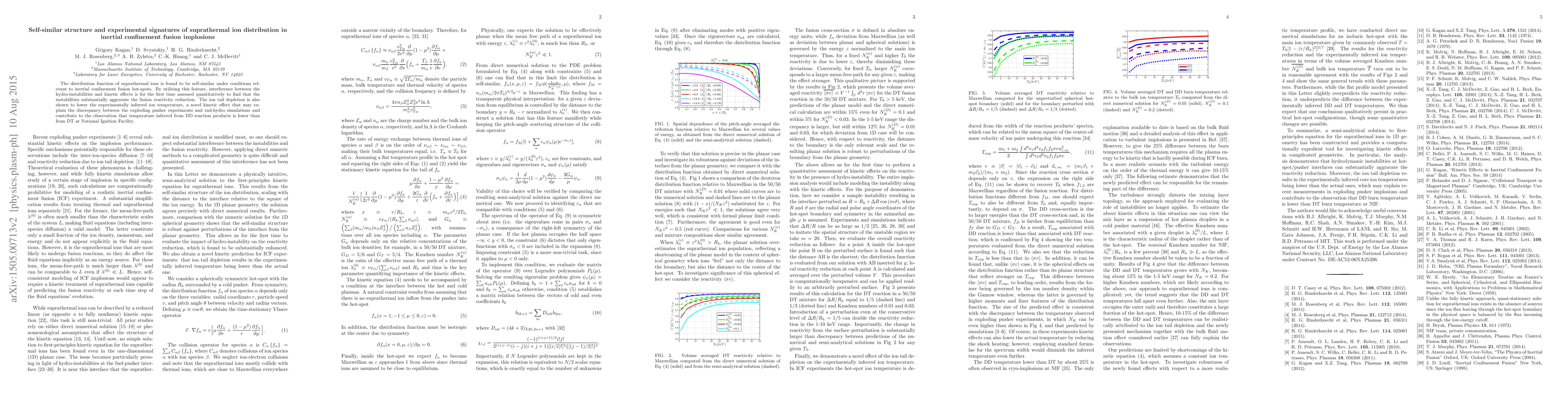 This paper reveals that suprathermal ion distribution in inertial confinement fusion implosions exhibits self-similarity, allowing for the first quantitative assessment of interference between hydro-instabilities and kinetic effects, which significantly reduces fusion reactivity. It also identifies a novel kinetic effect where ion tail depletion lowers inferred ion temperature, potentially explaining discrepancies in experimental and simulation results.