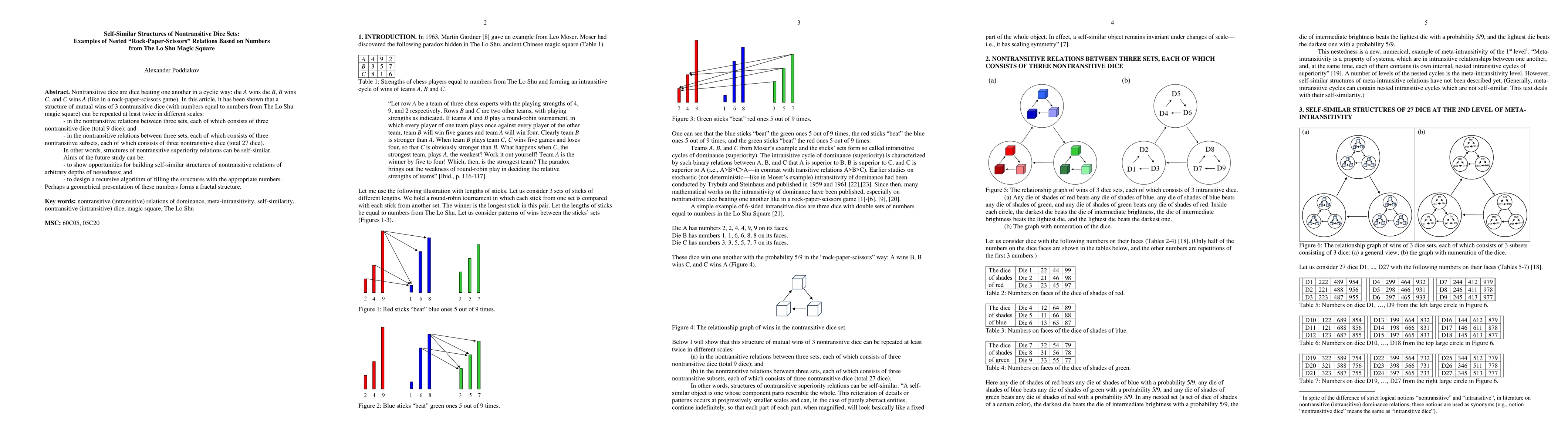 This paper explores self-similar structures of nontransitive dice sets, demonstrating that the nested "rock-paper-scissors" relations based on numbers from The Lo Shu magic square can repeat at least twice in different scales, involving 9 and 27 dice respectively. Future work aims to generalize these structures and develop a recursive algorithm for filling them.