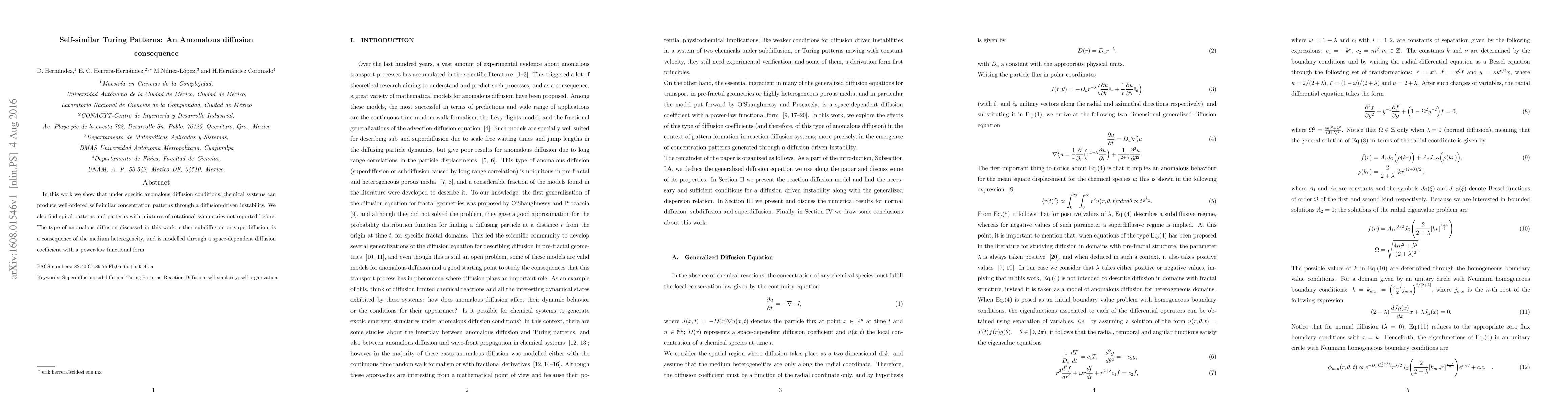 This paper demonstrates that chemical systems can generate self-similar, well-ordered concentration patterns under anomalous diffusion conditions, revealing previously unreported spiral and mixed rotational symmetry patterns. The anomalous diffusion, modeled via a power-law space-dependent diffusion coefficient, arises from medium heterogeneity.