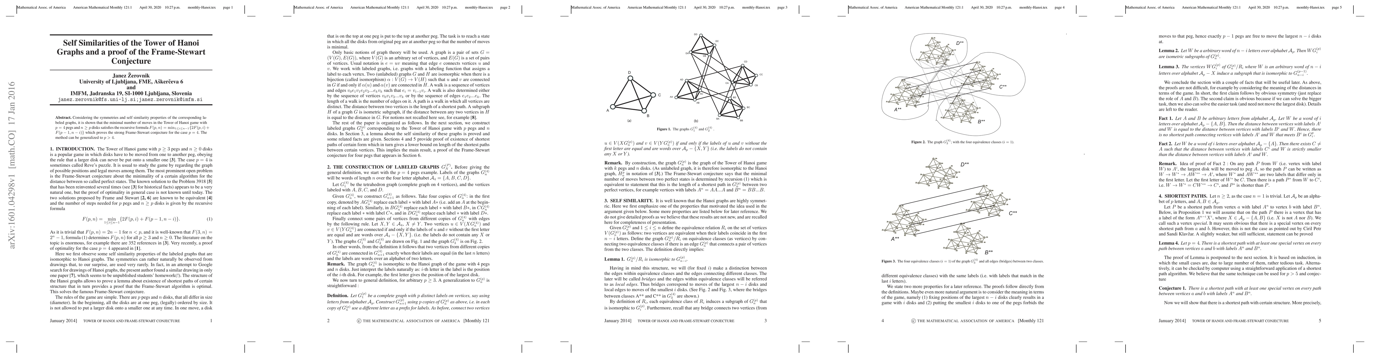 This paper demonstrates the self-similarities and symmetries of Tower of Hanoi graphs, proving the Frame-Stewart Conjecture for $p=4$ pegs through a recursive formula. The method is shown to be generalizable for $p>4$.