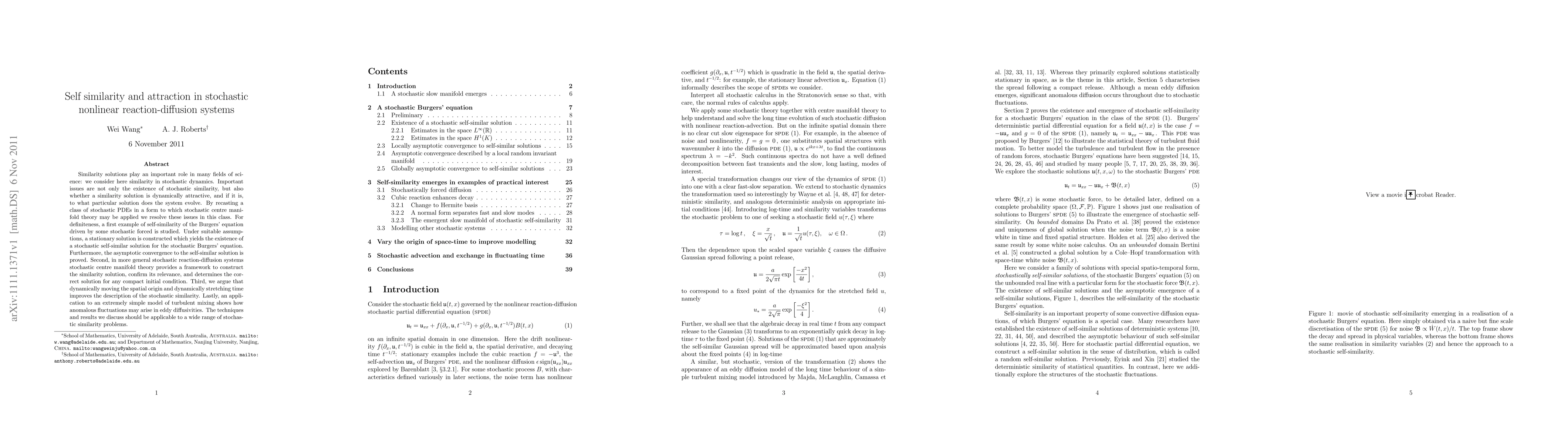 Similarity solutions play an important role in many fields of science: we consider here similarity in stochastic dynamics. Important issues are not only the existence of stochastic similarity, but also whether a similarity solution is dynamically attractive, and if it is, to what particular solution does the system evolve. By recasting a class of stochastic PDEs in a form to which stochastic centre manifold theory may be applied we resolve these issues in this class. For definiteness, a first example of self-similarity of the Burgers' equation driven by some stochastic forced is studied. Under suitable assumptions, a stationary solution is constructed which yields the existence of a stochastic self-similar solution for the stochastic Burgers' equation. Furthermore, the asymptotic convergence to the self-similar solution is proved. Second, in more general stochastic reaction-diffusion systems stochastic centre manifold theory provides a framework to construct the similarity solution, confirm its relevance, and determines the correct solution for any compact initial condition. Third, we argue that dynamically moving the spatial origin and dynamically stretching time improves the description of the stochastic similarity. Lastly, an application to an extremely simple model of turbulent mixing shows how anomalous fluctuations may arise in eddy diffusivities. The techniques and results we discuss should be applicable to a wide range of stochastic similarity problems.