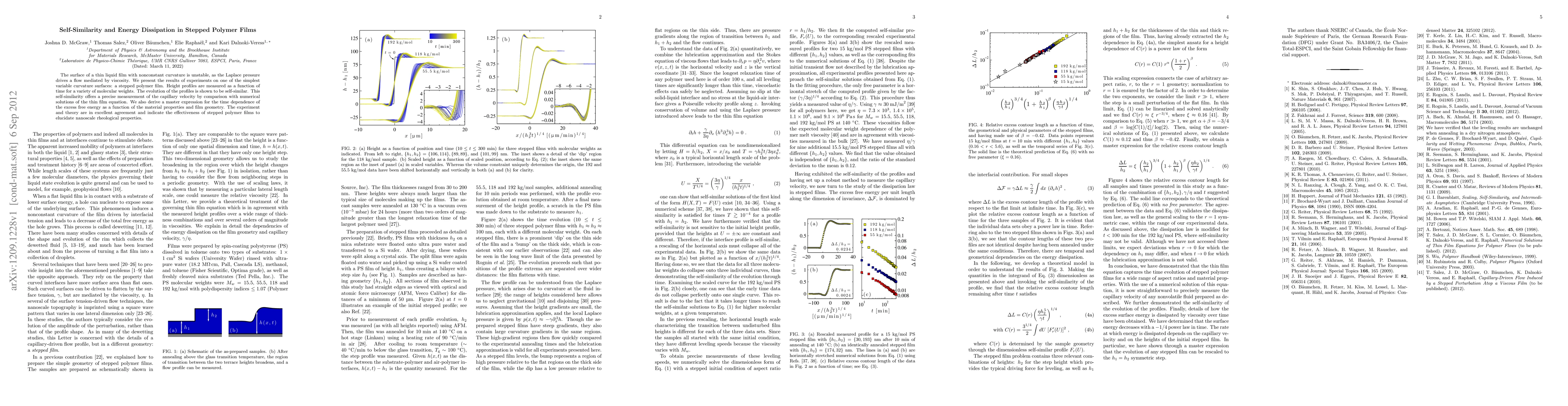 This paper investigates the self-similarity and energy dissipation in stepped polymer films, demonstrating that their height profiles evolve in a self-similar manner over time. The study provides a precise measurement of capillary velocity and derives a master expression for the time dependence of excess free energy, showing excellent agreement between experiment and theory.