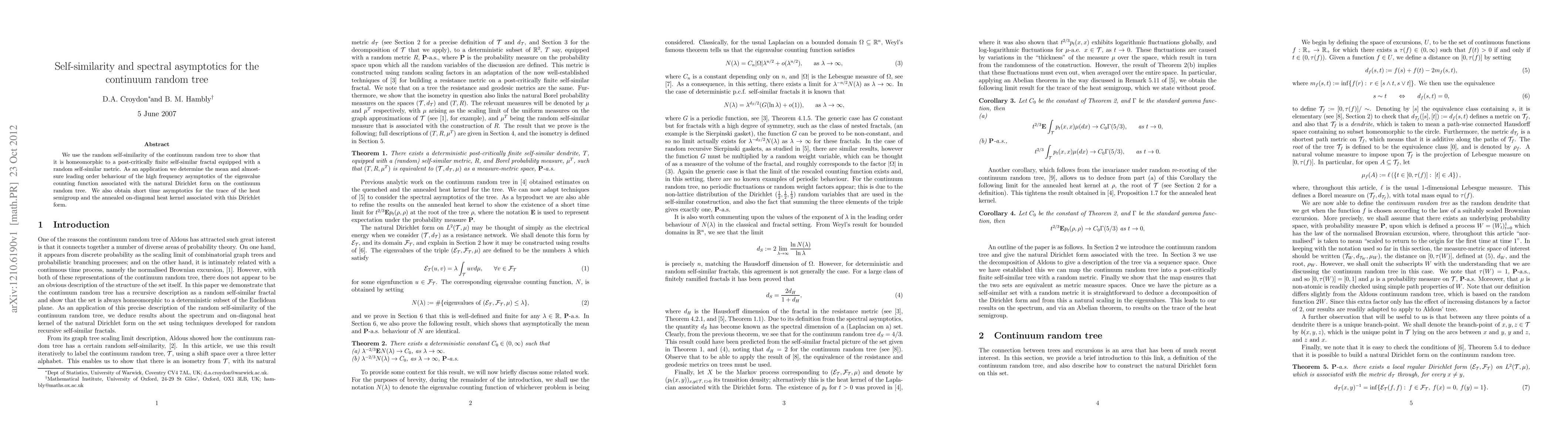 The continuum random tree exhibits self-similarity and is homeomorphic to a self-similar fractal with a random metric. This property aids in determining the high frequency asymptotics of its eigenvalue counting function and the short time behavior of its heat semigroup.