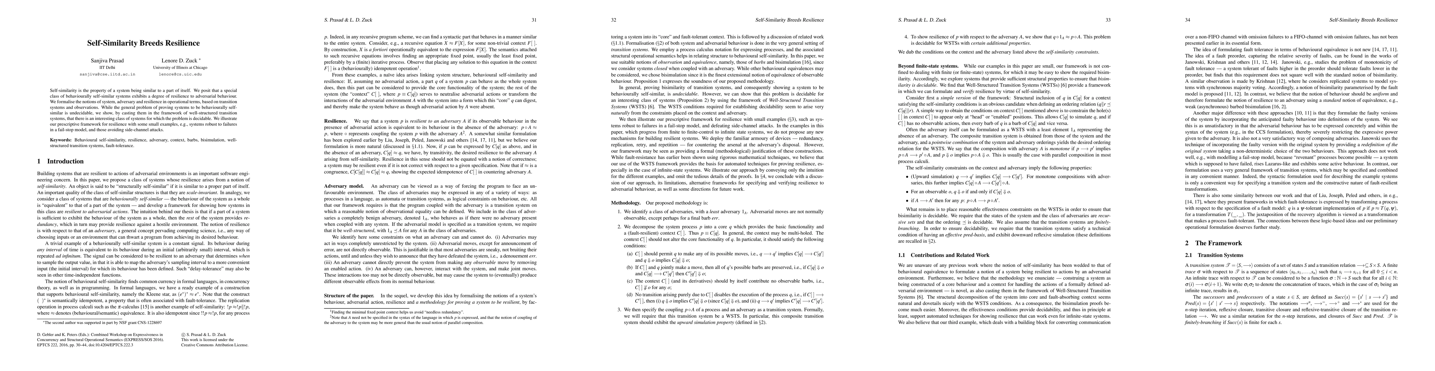 Self-similarity is the property of a system being similar to a part of itself. We posit that a special class of behaviourally self-similar systems exhibits a degree of resilience to adversarial behaviour. We formalise the notions of system, adversary and resilience in operational terms, based on transition systems and observations. While the general problem of proving systems to be behaviourally self-similar is undecidable, we show, by casting them in the framework of well-structured transition systems, that there is an interesting class of systems for which the problem is decidable. We illustrate our prescriptive framework for resilience with some small examples, e.g., systems robust to failures in a fail-stop model, and those avoiding side-channel attacks.