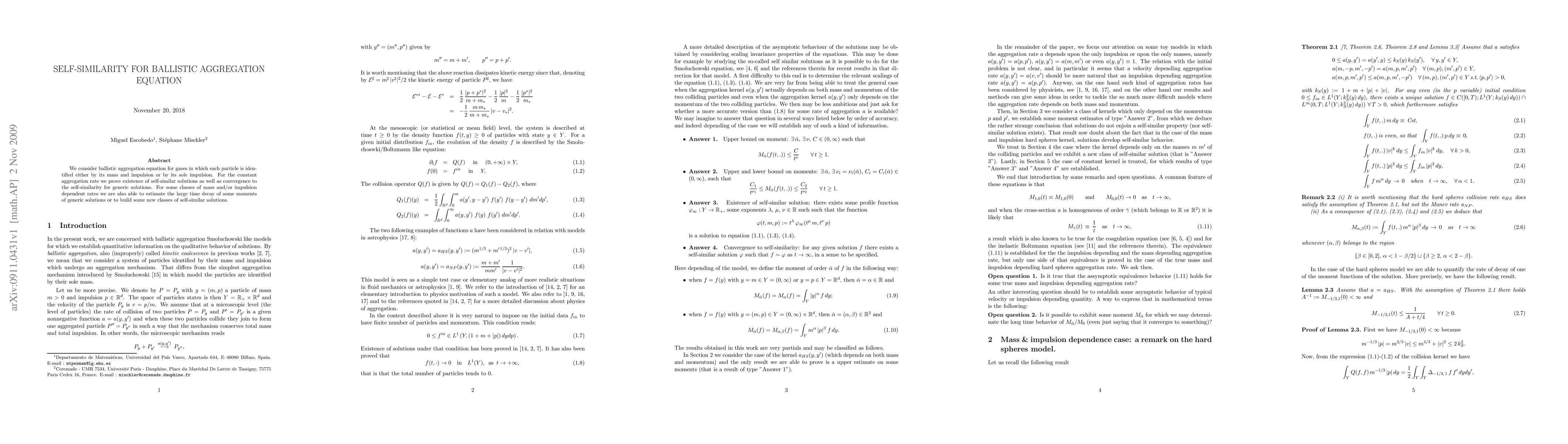 We consider ballistic aggregation equation for gases in which each particle is iden- ti?ed either by its mass and impulsion or by its sole impulsion. For the constant aggregation rate we prove existence of self-similar solutions as well as convergence to the self-similarity for generic solutions. For some classes of mass and/or impulsion dependent rates we are also able to estimate the large time decay of some moments of generic solutions or to build some new classes of self-similar solutions.