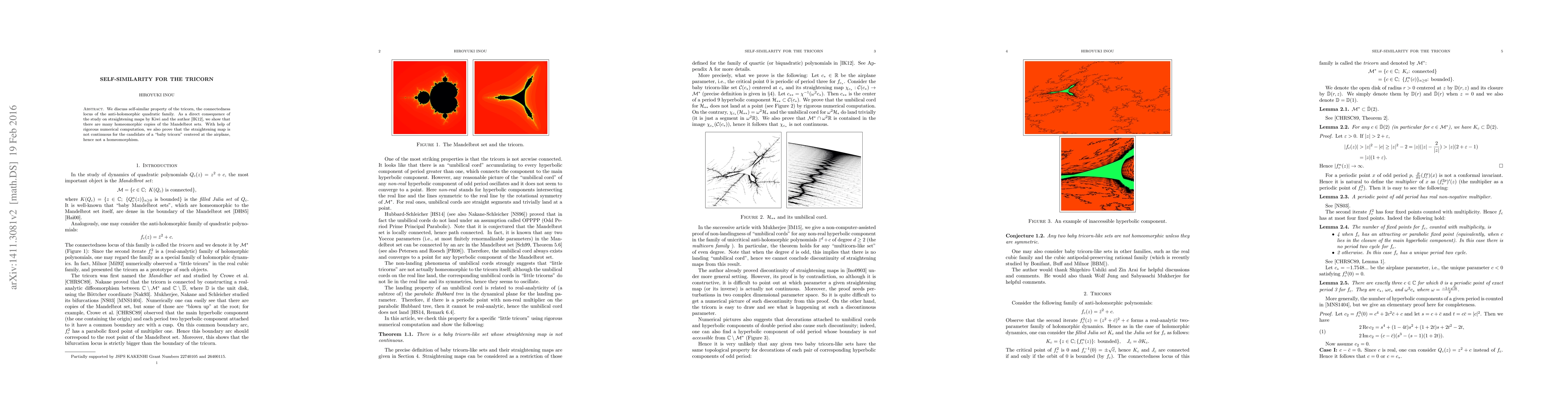 This paper explores the self-similarity of the tricorn, revealing numerous homeomorphic copies of the Mandelbrot set. It also demonstrates that the straightening map is not continuous for a "baby tricorn," confirming it is not a homeomorphism.