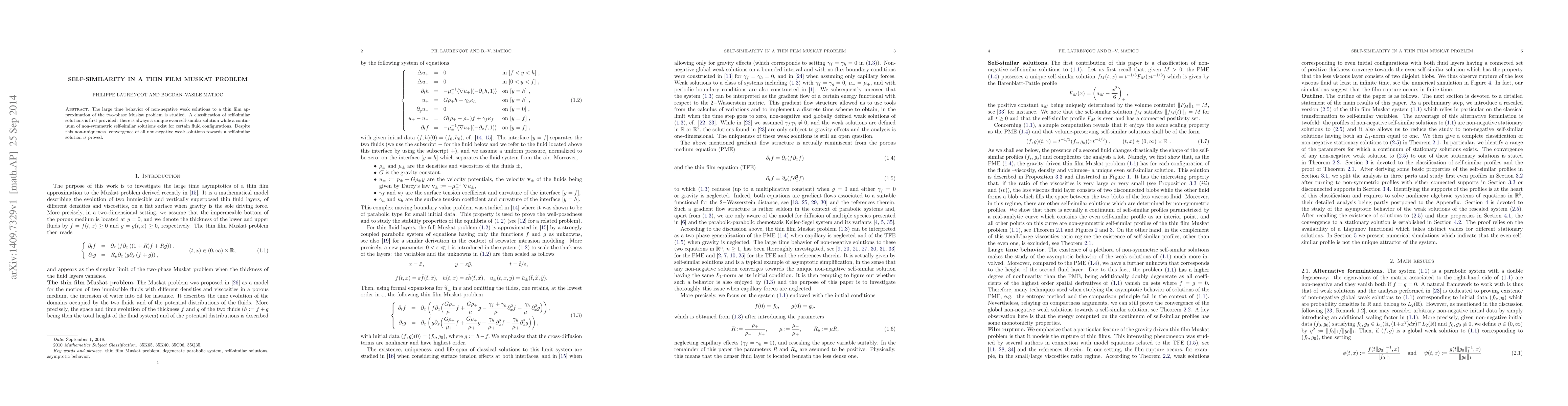 This paper studies the long-term behavior of weak solutions to a thin film Muskat problem, identifying unique even self-similar solutions and a continuum of non-symmetric ones. It proves that all non-negative weak solutions converge to a self-similar solution over time.
