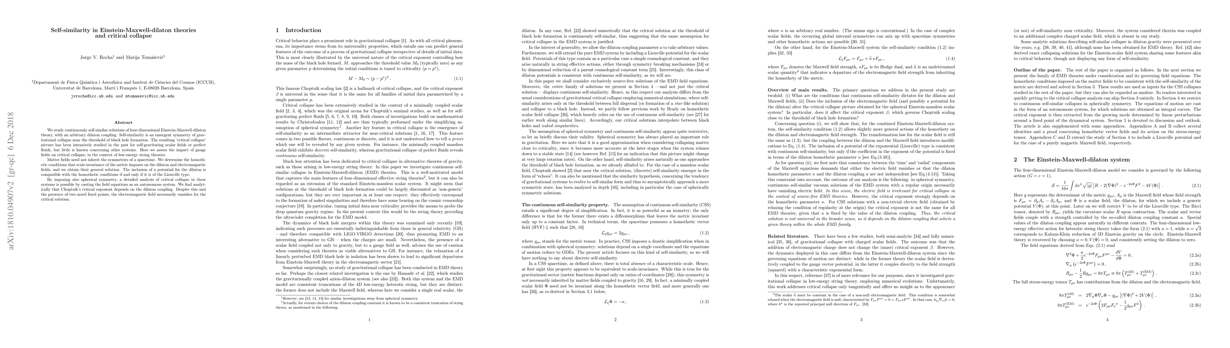 We study continuously self-similar solutions of four-dimensional Einstein-Maxwell-dilaton theory, with an arbitrary dilaton coupling. Self-similarity is an emergent symmetry of gravitational collapse near the threshold of black hole formation. The resulting `critical collapse' picture has been intensively studied in the past for self-gravitating scalar fields or perfect fluids, but little is known concerning other systems. Here we assess the impact of gauge fields on critical collapse, in the context of low-energy string theories. Matter fields need not inherit the symmetries of a spacetime. We determine the homothetic conditions that scale-invariance of the metric imposes on the dilaton and electromagnetic fields, and we obtain their general solution. The inclusion of a potential for the dilaton is compatible with the homothetic conditions if and only if it is of the Liouville type. By imposing also spherical symmetry, a detailed analysis of critical collapse in these systems is possible by casting the field equations as an autonomous system. We find analytically that Choptuik's critical exponent depends on the dilaton coupling. Despite this and the presence of two novel fixed points, the electromagnetic field necessarily vanishes for the critical solution.