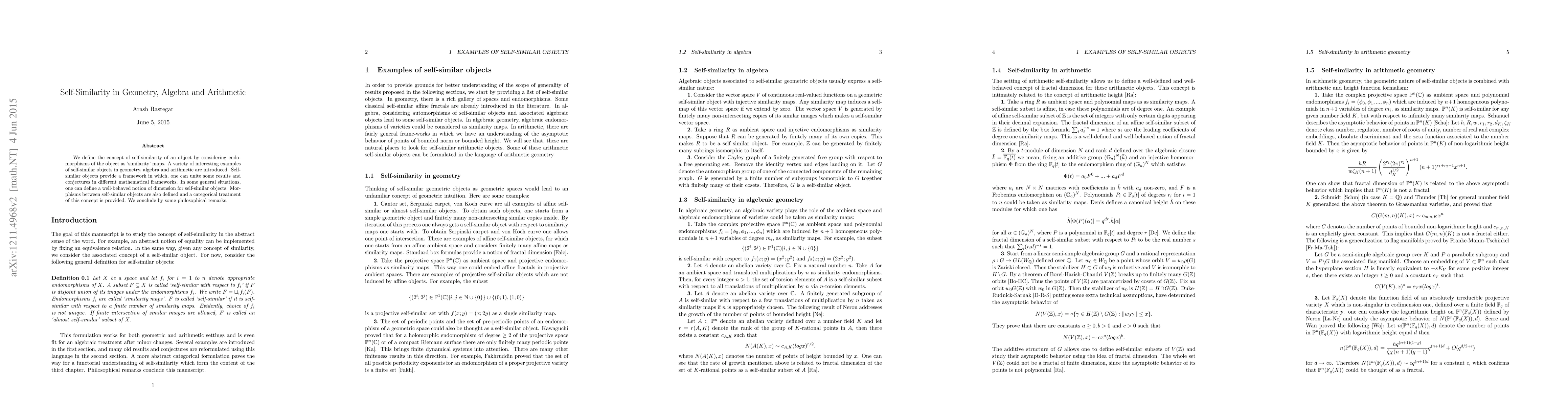 We define the concept of self-similarity of an object by considering endomorphisms of the object as `similarity' maps. A variety of interesting examples of self-similar objects in geometry, algebra and arithmetic are introduced. Self-similar objects provide a framework in which, one can unite some results and conjectures in different mathematical frameworks. In some general situations, one can define a well-behaved notion of dimension for self-similar objects. Morphisms between self-similar objects are also defined and a categorical treatment of this concept is provided. We conclude by some philosophical remarks.