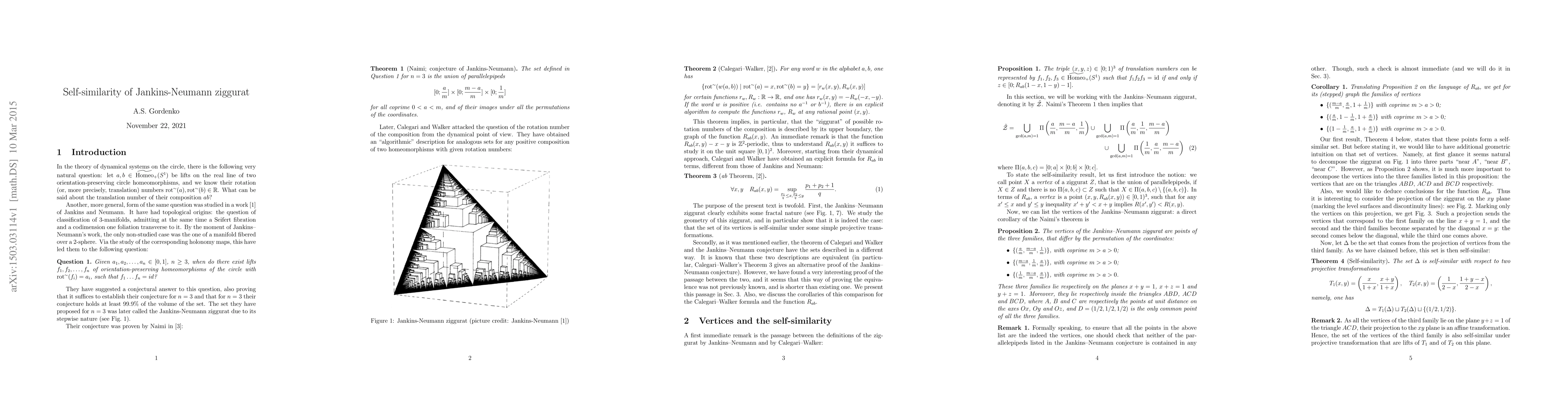 The paper investigates the self-similarity of the Jankins-Neumann ziggurat, a mathematical concept used to describe rotation numbers in circle homeomorphisms, and proposes an equivalence between two formulas defining it.