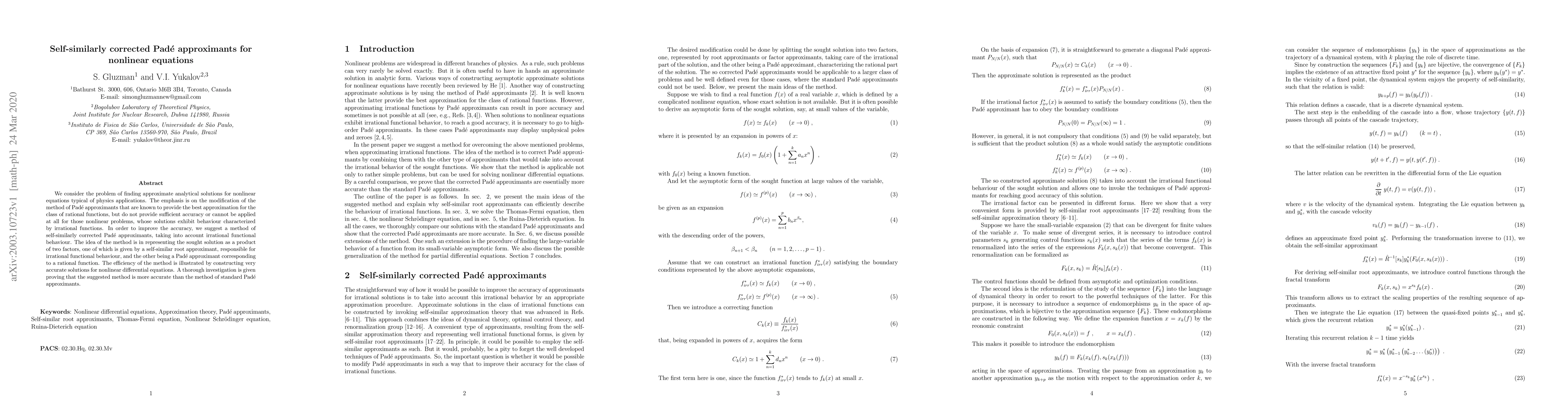 This paper proposes a self-similarly corrected Padé approximant method to improve the accuracy of analytical solutions for nonlinear equations, especially those exhibiting irrational functional behavior. The method combines a self-similar root approximant with a standard Padé approximant, demonstrating superior accuracy over traditional Padé approximants for nonlinear differential equations.