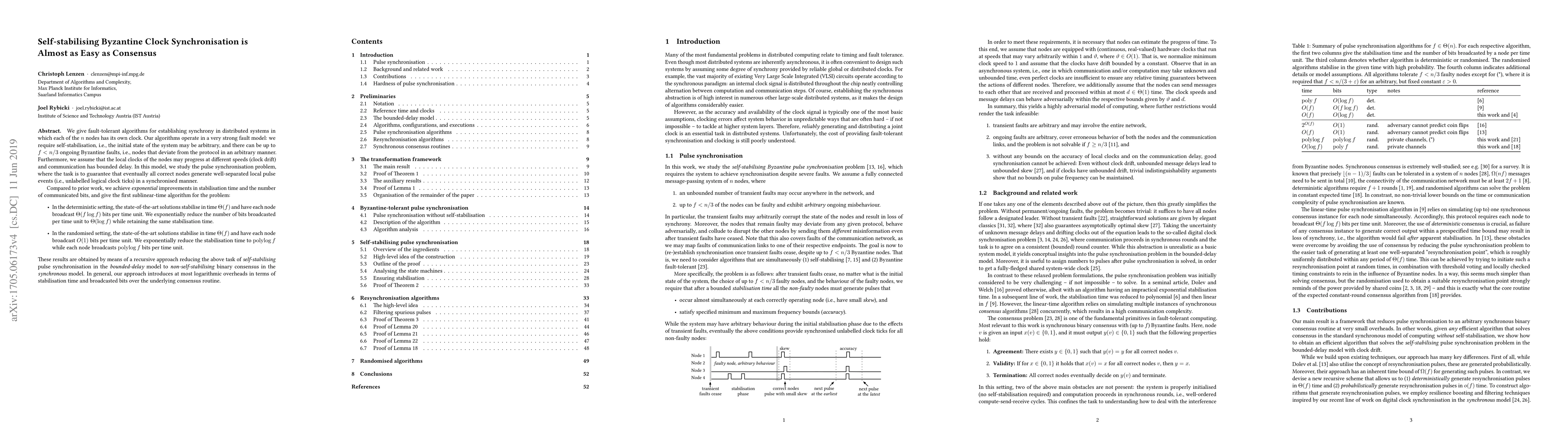 This research presents efficient algorithms for achieving clock synchronization in distributed systems, tolerating up to f<n/3 Byzantine faults. It improves stabilization time and communication bits exponentially compared to prior work, achieving sublinear time in both deterministic and randomized settings. The methodology leverages a recursive approach, reducing self-stabilising pulse synchronization to consensus problems in different models with logarithmic overheads.
