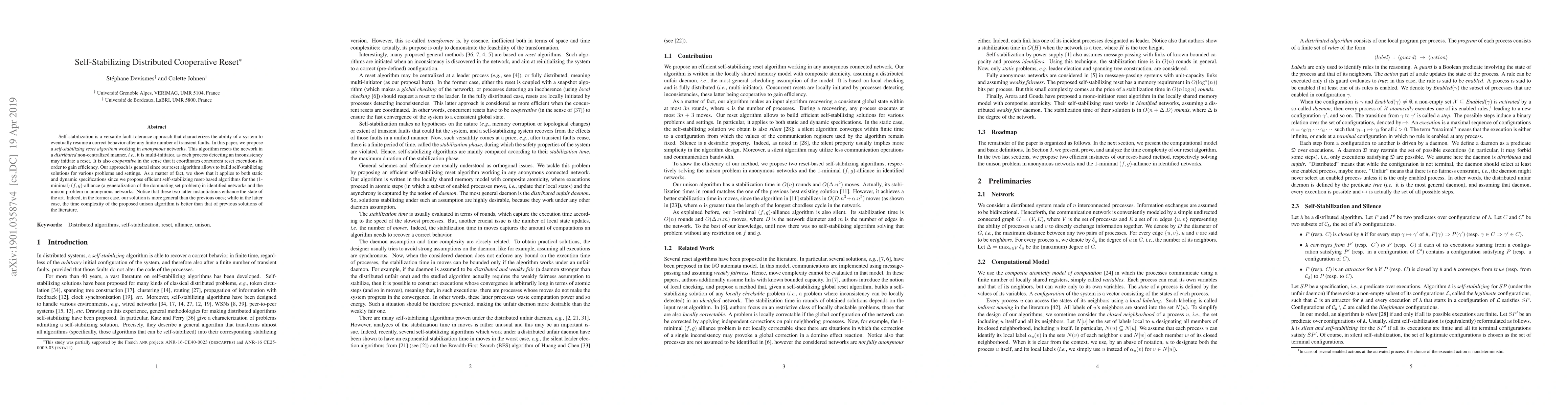 Self-stabilization is a versatile fault-tolerance approach that characterizes the ability of a system to eventually resume a correct behavior after any finite number of transient faults. In this paper, we propose a self-stabilizing reset algorithm working in anonymous networks. This algorithm resets the network in a distributed non-centralized manner, i.e., it is multi-initiator, as each process detecting an inconsistency may initiate a reset. It is also cooperative in the sense that it coordinates concurrent reset executions in order to gain efficiency. Our approach is general since our reset algorithm allows to build self-stabilizing solutions for various problems and settings. As a matter of facts, we show that it applies to both static and dynamic specifications since we propose efficient self-stabilizing reset-based algorithms for the (1-minimal) $f,g)-alliance (a generalization of the dominating set problem) in identified networks and the unison problem in anonymous networks. Notice that these two latter instantiations enhance the state of the art. Indeed, in the former case, our solution is more general than the previous ones; while in the latter case, the complexity of the proposed unison algorithm is better than that of previous solutions of the literature.