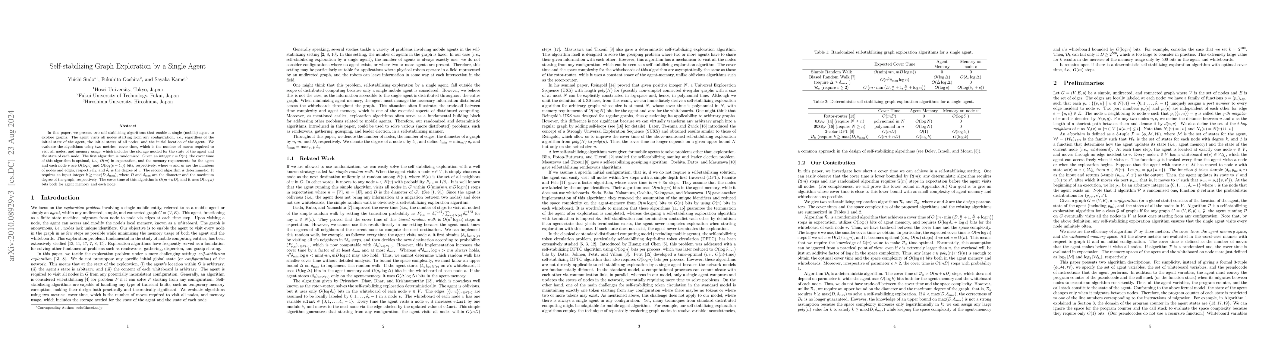 In this paper, we give two self-stabilizing algorithms that solve graph exploration by a single (mobile) agent. The proposed algorithms are self-stabilizing: the agent running each of the algorithms visits all nodes starting from any initial configuration where the state of the agent and the states of all nodes are arbitrary and the agent is located at an arbitrary node. We evaluate algorithms with two metrics, the cover time, that is the number of moves required to visit all nodes, and the amount of space to store the state of the agent and the states of the nodes. The first algorithm is a randomized one. The cover time of this algorithm is optimal (\ie $O(m)$) in expectation and it uses $O(\log n)$ bits for both the agent and each node, where $n$ and $m$ are the number of agents and the number of edges in a given graph, respectively. The second algorithm is deterministic. The cover time is $O(m + nD)$, where $D$ is the diameter of the graph. It uses $O(\log n)$ bits for the agent-memory and $O(\delta + \log n)$ bits for the memory of each node with degree $\delta$. We require the knowledge of an upper bound on $n$ (resp. $D$) for the first (resp.~the second) algorithm. However, this is a weak assumption from a practical point of view because the knowledge of any value $\ge n$ (resp.~$\ge D$) in $O(poly(n))$ is sufficient to obtain the above time and space complexity.