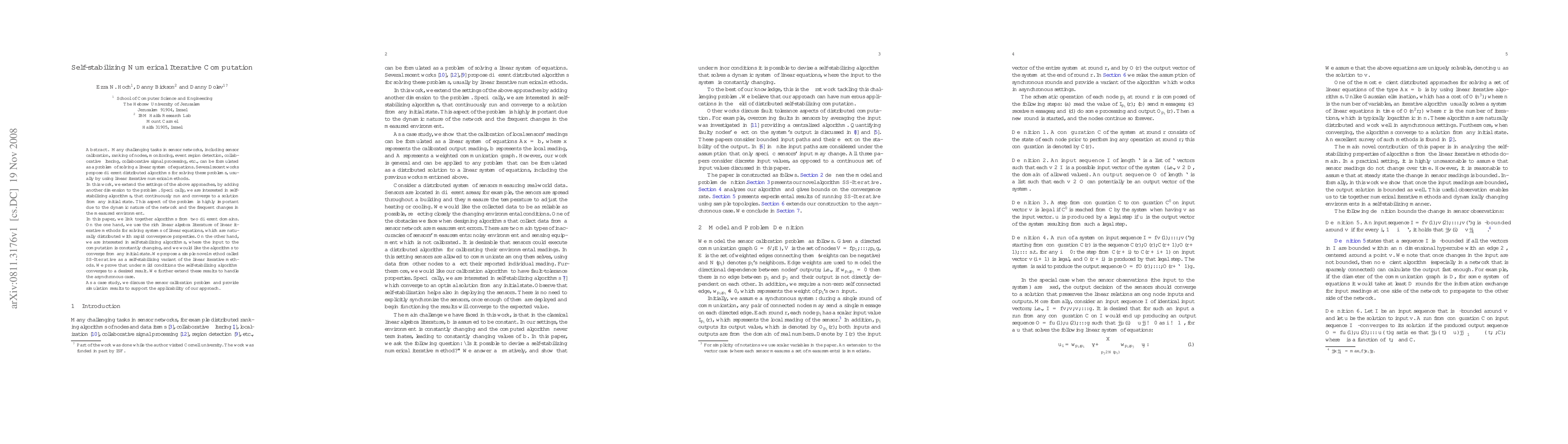 Many challenging tasks in sensor networks, including sensor calibration, ranking of nodes, monitoring, event region detection, collaborative filtering, collaborative signal processing, {\em etc.}, can be formulated as a problem of solving a linear system of equations. Several recent works propose different distributed algorithms for solving these problems, usually by using linear iterative numerical methods. In this work, we extend the settings of the above approaches, by adding another dimension to the problem. Specifically, we are interested in {\em self-stabilizing} algorithms, that continuously run and converge to a solution from any initial state. This aspect of the problem is highly important due to the dynamic nature of the network and the frequent changes in the measured environment. In this paper, we link together algorithms from two different domains. On the one hand, we use the rich linear algebra literature of linear iterative methods for solving systems of linear equations, which are naturally distributed with rapid convergence properties. On the other hand, we are interested in self-stabilizing algorithms, where the input to the computation is constantly changing, and we would like the algorithms to converge from any initial state. We propose a simple novel method called \syncAlg as a self-stabilizing variant of the linear iterative methods. We prove that under mild conditions the self-stabilizing algorithm converges to a desired result. We further extend these results to handle the asynchronous case. As a case study, we discuss the sensor calibration problem and provide simulation results to support the applicability of our approach.
