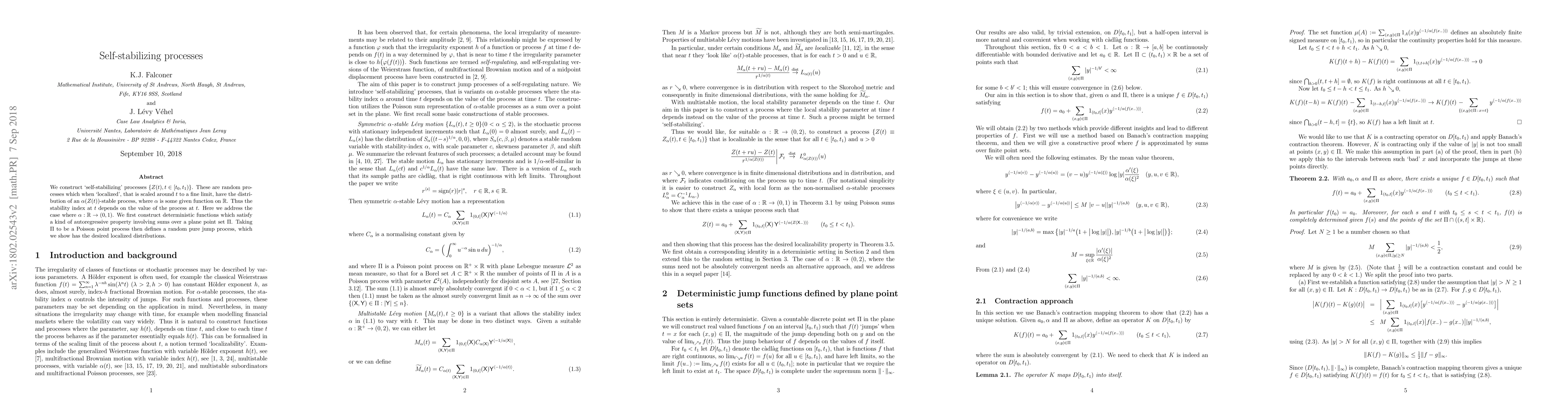 We construct `self-stabilizing' processes {Z(t), t $\in [t_0,t_1)$}. These are random processes which when `localized', that is scaled around t to a fine limit, have the distribution of an $\alpha$(Z(t))-stable process, where $\alpha$ is some given function on R. Thus the stability index at t depends on the value of the process at t. Here we address the case where $\alpha$: R $\to$ (0,1). We first construct deterministic functions which satisfy a kind of autoregressive property involving sums over a plane point set $\Pi$. Taking $\Pi$ to be a Poisson point process then defines a random pure jump process, which we show has the desired localized distributions.