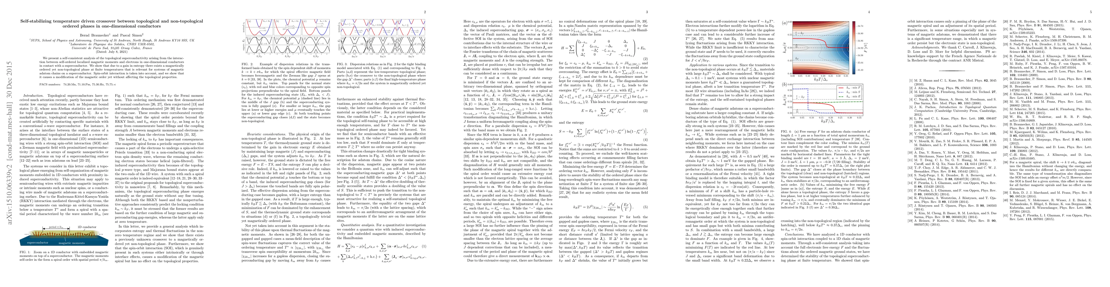 We present a self-consistent analysis of the topological superconductivity arising from the interaction between self-ordered localized magnetic moments and electrons in one-dimensional conductors in contact with a superconductor. We show that due to a gain in entropy there exists a magnetically ordered yet non-topological phase at finite temperatures that is relevant for systems of magnetic adatom chains on a superconductor. Spin-orbit interaction is taken into account, and we show that it causes a modification of the magnetic order yet without affecting the topological properties.