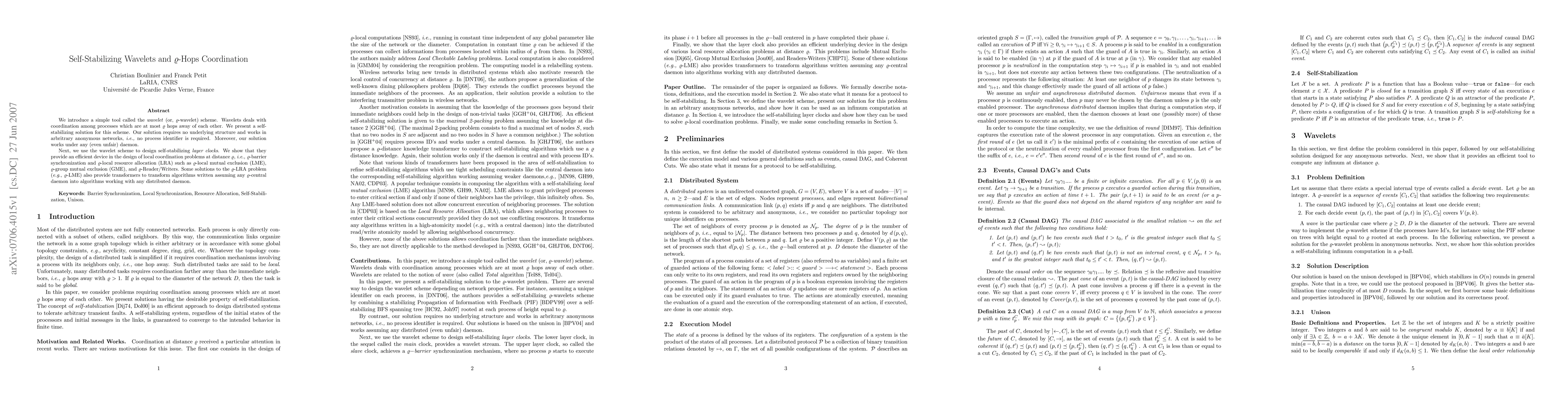 We introduce a simple tool called the wavelet (or, r-wavelet) scheme. Wavelets deals with coordination among processes which are at most r hops away of each other. We present a selfstabilizing solution for this scheme. Our solution requires no underlying structure and works in arbritrary anonymous networks, i.e., no process identifier is required. Moreover, our solution works under any (even unfair) daemon. Next, we use the wavelet scheme to design self-stabilizing layer clocks. We show that they provide an efficient device in the design of local coordination problems at distance r, i.e., r-barrier synchronization and r-local resource allocation (LRA) such as r-local mutual exclusion (LME), r-group mutual exclusion (GME), and r-Reader/Writers. Some solutions to the r-LRA problem (e.g., r-LME) also provide transformers to transform algorithms written assuming any r-central daemon into algorithms working with any distributed daemon.