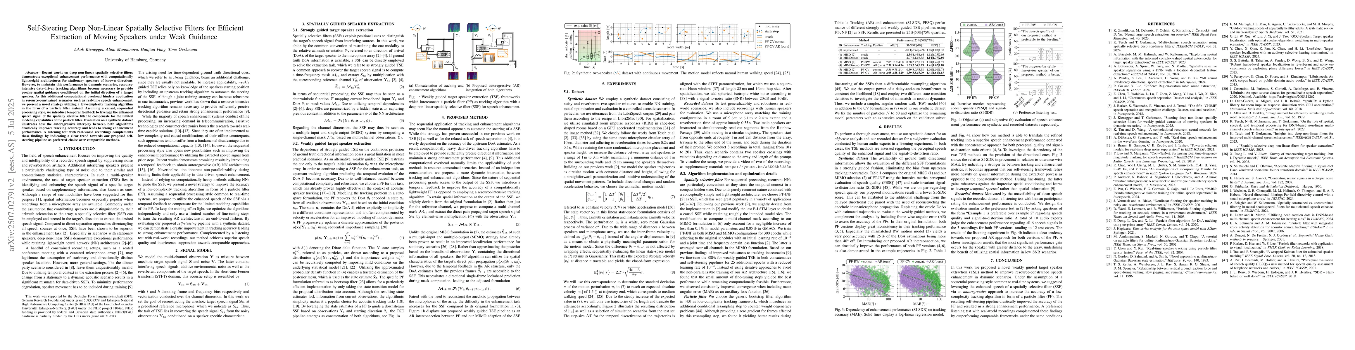 Recent works on deep non-linear spatially selective filters demonstrate exceptional enhancement performance with computationally lightweight architectures for stationary speakers of known directions. However, to maintain this performance in dynamic scenarios, resource-intensive data-driven tracking algorithms become necessary to provide precise spatial guidance conditioned on the initial direction of a target speaker. As this additional computational overhead hinders application in resource-constrained scenarios such as real-time speech enhancement, we present a novel strategy utilizing a low-complexity tracking algorithm in the form of a particle filter instead. Assuming a causal, sequential processing style, we introduce temporal feedback to leverage the enhanced speech signal of the spatially selective filter to compensate for the limited modeling capabilities of the particle filter. Evaluation on a synthetic dataset illustrates how the autoregressive interplay between both algorithms drastically improves tracking accuracy and leads to strong enhancement performance. A listening test with real-world recordings complements these findings by indicating a clear trend towards our proposed self-steering pipeline as preferred choice over comparable methods.