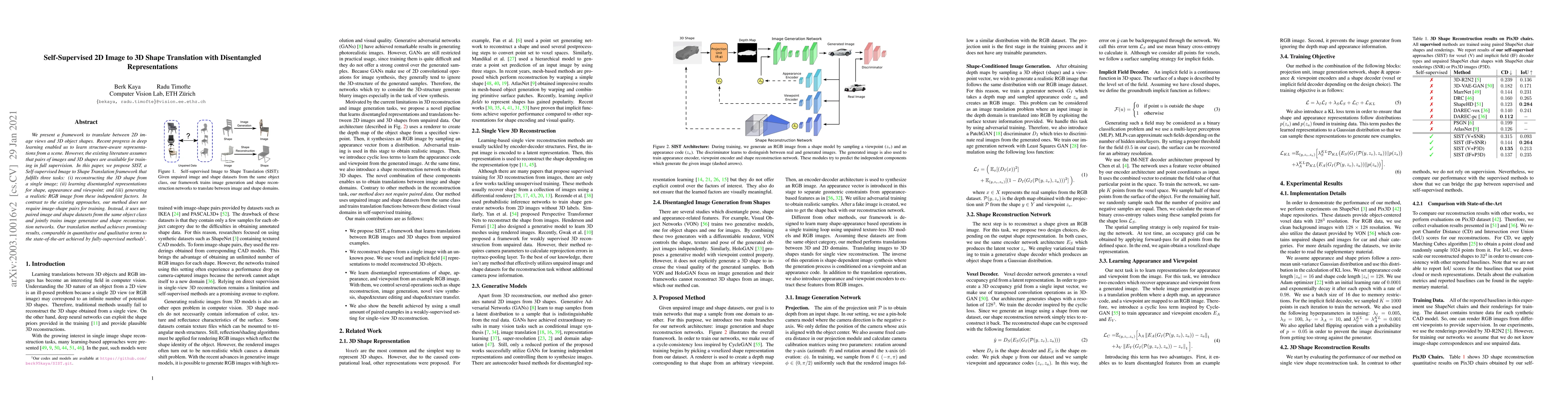 This paper introduces SIST, a self-supervised framework for translating 2D images to 3D shapes without requiring paired training data. It reconstructs 3D shapes from single images, learns disentangled representations, and generates realistic RGB images from these factors.