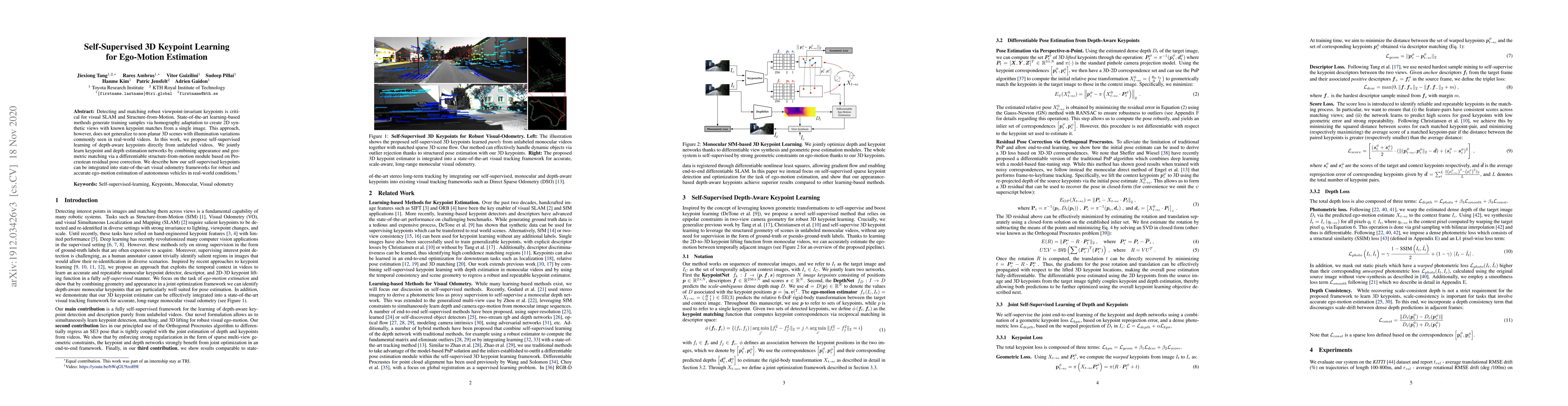 This paper proposes a self-supervised method for learning depth-aware 3D keypoints directly from unlabeled videos, aiming to improve ego-motion estimation in real-world conditions by addressing limitations of existing 2D homography-based approaches. The method integrates keypoint and depth estimation networks using a differentiable structure-from-motion module, enabling robust visual odometry for autonomous vehicles.