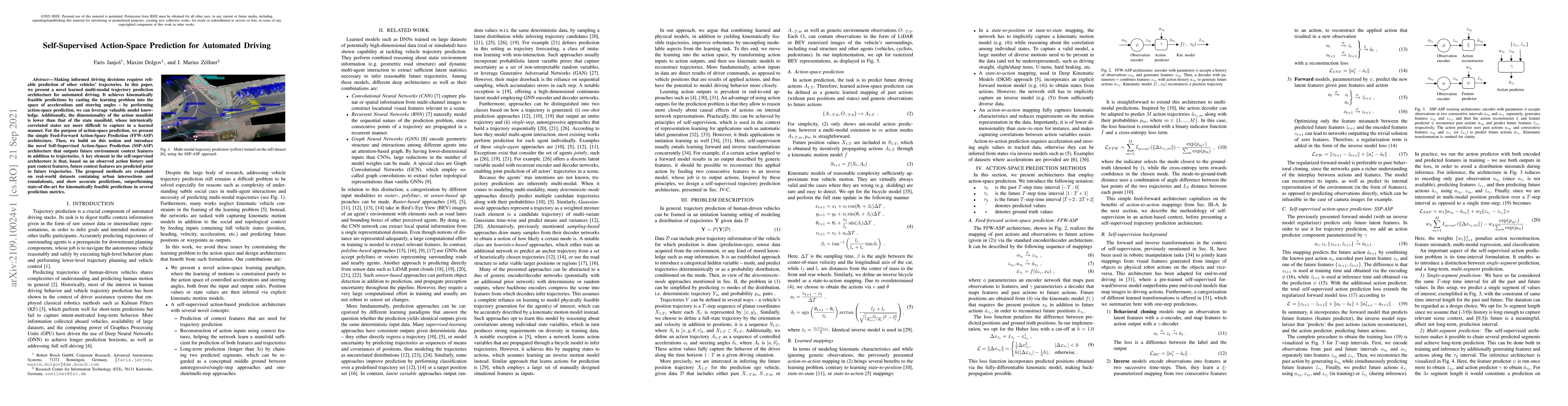 This paper introduces a self-supervised architecture for predicting vehicle trajectories in automated driving by predicting future accelerations and steering angles (action-space prediction). The proposed method outperforms existing models in real-world datasets by predicting kinematically feasible trajectories and future environment context features based on past actions and context.
