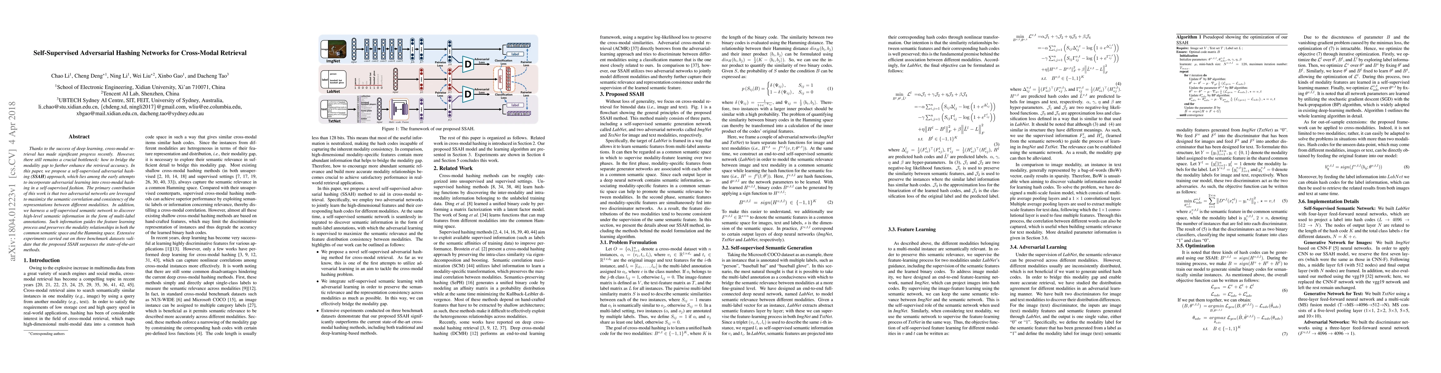 This paper introduces a self-supervised adversarial hashing network (SSAH) to bridge the modality gap in cross-modal retrieval, leveraging adversarial learning to enhance representation consistency and semantic correlation. The method uses self-supervised semantic networks to guide feature learning and outperforms existing state-of-the-art methods on benchmark datasets.