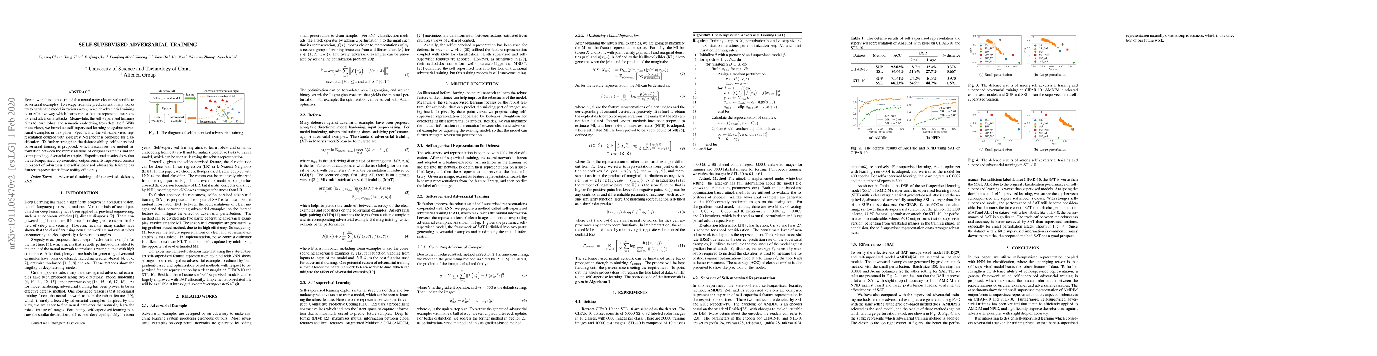 This paper proposes self-supervised adversarial training to enhance neural network robustness against adversarial attacks. It combines self-supervised learning with k-Nearest Neighbour classification and introduces a method to maximize mutual information between original and adversarial examples, demonstrating improved defense efficiency.