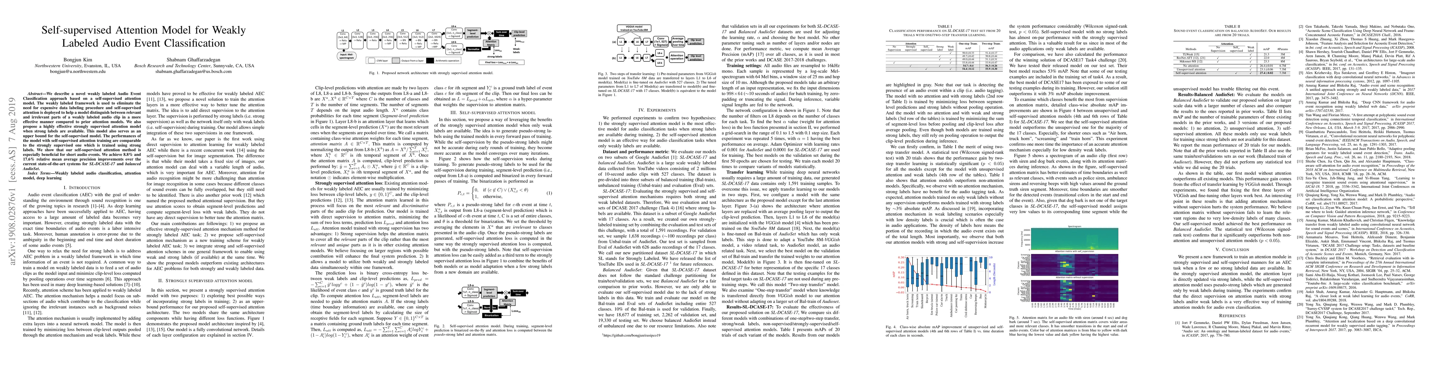 We describe a novel weakly labeled Audio Event Classification approach based on a self-supervised attention model. The weakly labeled framework is used to eliminate the need for expensive data labeling procedure and self-supervised attention is deployed to help a model distinguish between relevant and irrelevant parts of a weakly labeled audio clip in a more effective manner compared to prior attention models. We also propose a highly effective strongly supervised attention model when strong labels are available. This model also serves as an upper bound for the self-supervised model. The performances of the model with self-supervised attention training are comparable to the strongly supervised one which is trained using strong labels. We show that our self-supervised attention method is especially beneficial for short audio events. We achieve 8.8% and 17.6% relative mean average precision improvements over the current state-of-the-art systems for SL-DCASE-17 and balanced AudioSet.