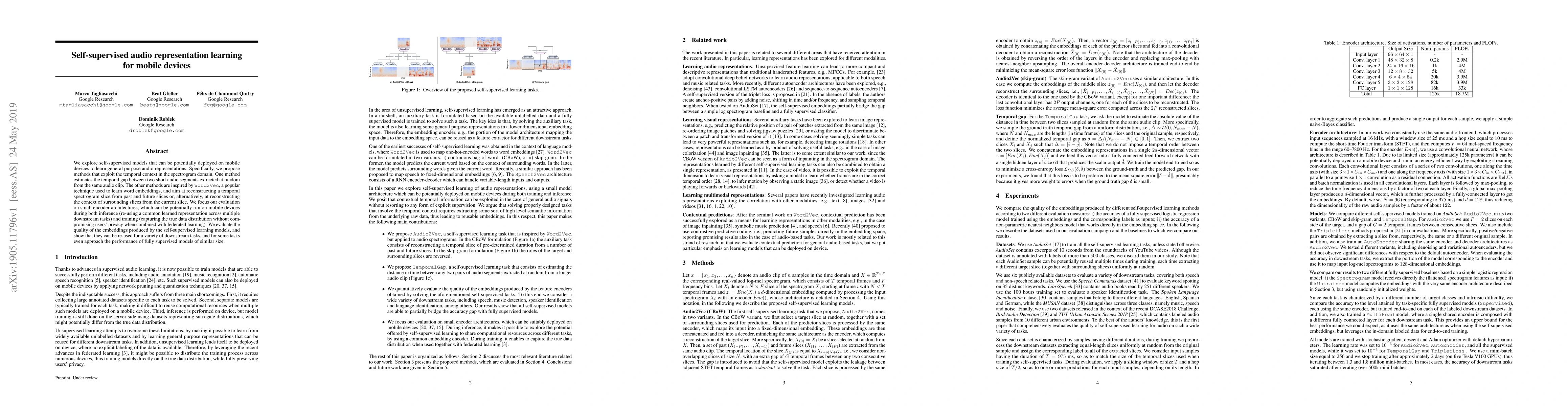 We explore self-supervised models that can be potentially deployed on mobile devices to learn general purpose audio representations. Specifically, we propose methods that exploit the temporal context in the spectrogram domain. One method estimates the temporal gap between two short audio segments extracted at random from the same audio clip. The other methods are inspired by Word2Vec, a popular technique used to learn word embeddings, and aim at reconstructing a temporal spectrogram slice from past and future slices or, alternatively, at reconstructing the context of surrounding slices from the current slice. We focus our evaluation on small encoder architectures, which can be potentially run on mobile devices during both inference (re-using a common learned representation across multiple downstream tasks) and training (capturing the true data distribution without compromising users' privacy when combined with federated learning). We evaluate the quality of the embeddings produced by the self-supervised learning models, and show that they can be re-used for a variety of downstream tasks, and for some tasks even approach the performance of fully supervised models of similar size.
