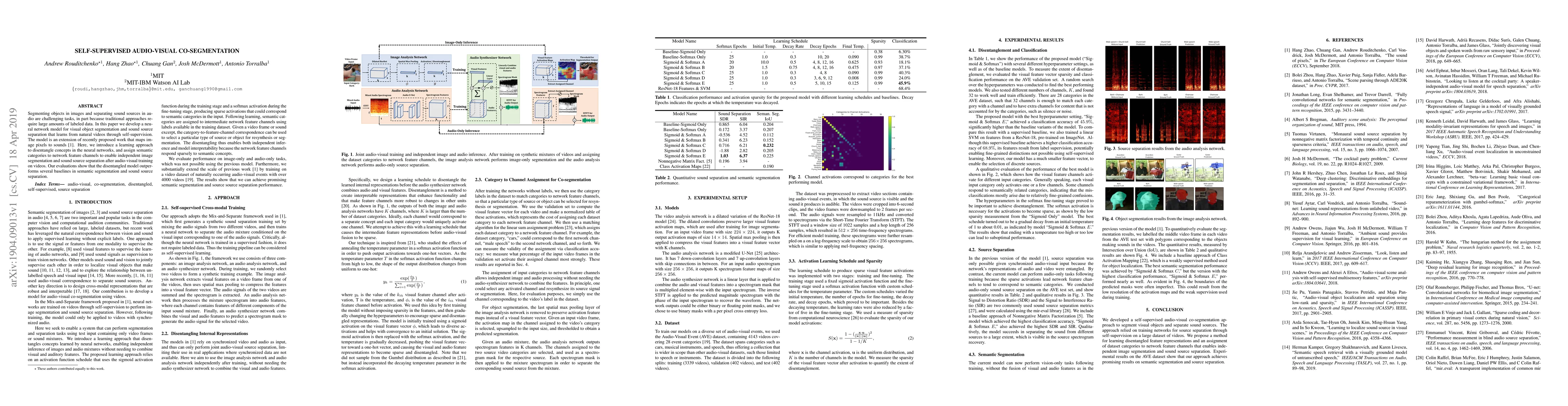 This paper proposes a self-supervised neural network model for audio-visual co-segmentation, learning from natural videos without labeled data. It disentangles concepts and assigns semantic categories to feature channels, achieving better performance in semantic segmentation and sound source separation compared to baselines.