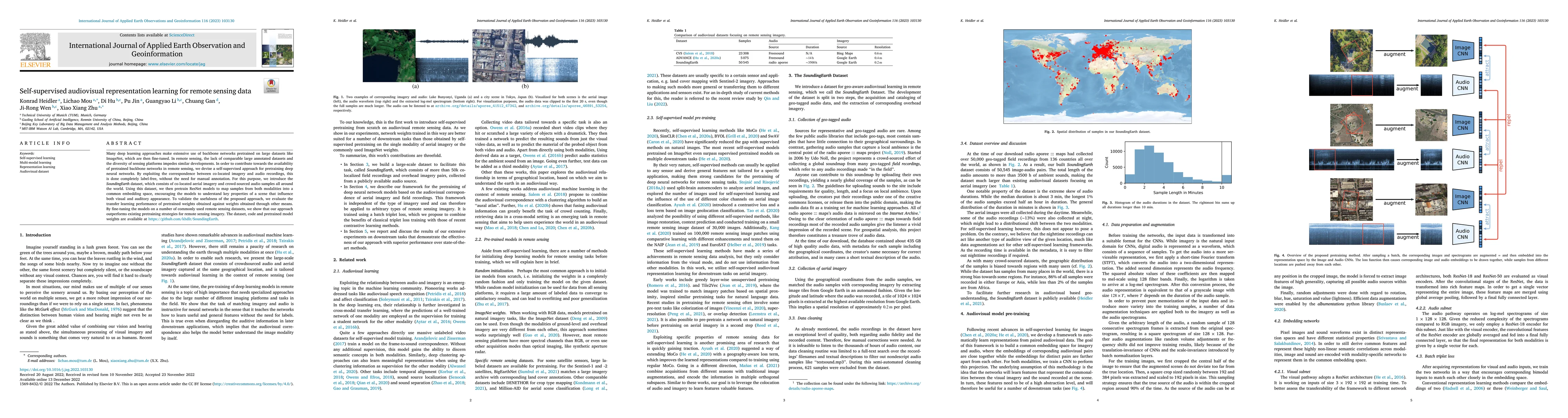 This paper proposes a self-supervised method for pre-training deep neural networks in remote sensing using geo-tagged audio and imagery data from the newly introduced SoundingEarth dataset. The approach outperforms existing pre-training strategies, demonstrating improved transfer learning performance for remote sensing tasks.