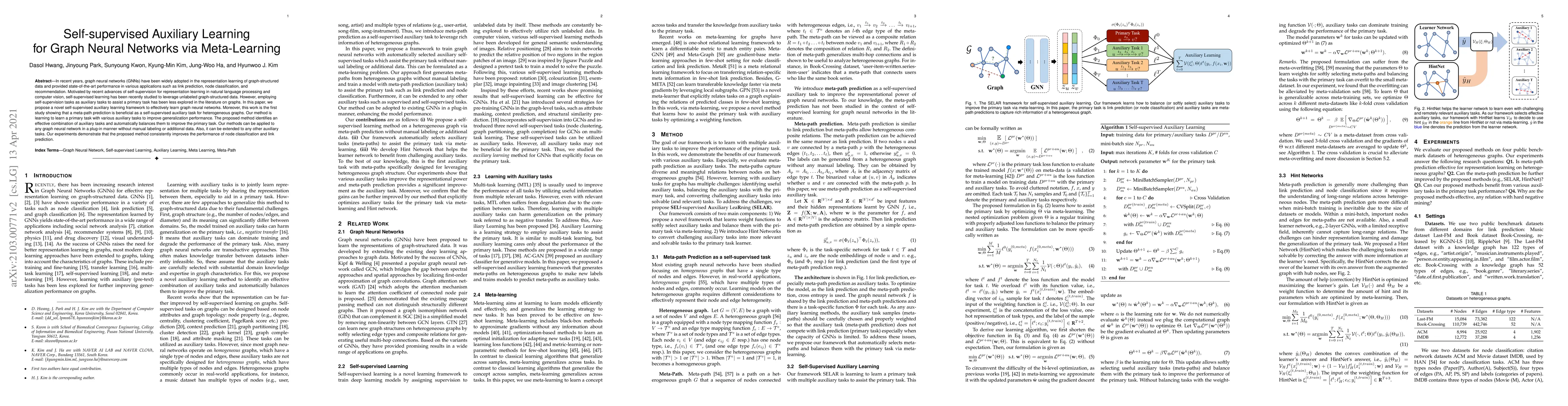 This paper proposes a self-supervised auxiliary learning framework for graph neural networks using meta-learning, introducing meta-path prediction as an effective self-supervised task for heterogeneous graphs. The method improves primary tasks like node classification and link prediction by balancing various auxiliary tasks without requiring manual labeling.