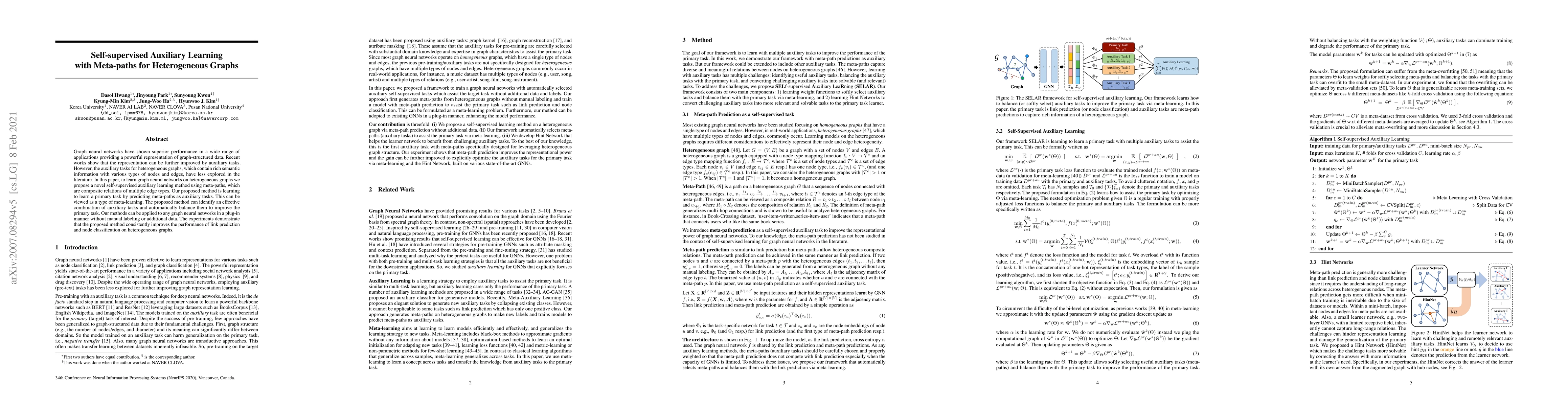 This paper proposes a self-supervised auxiliary learning method using meta-paths for graph neural networks on heterogeneous graphs. The method improves primary tasks by predicting meta-paths as auxiliary tasks, achieving better performance in link prediction and node classification without requiring manual labeling or additional data.