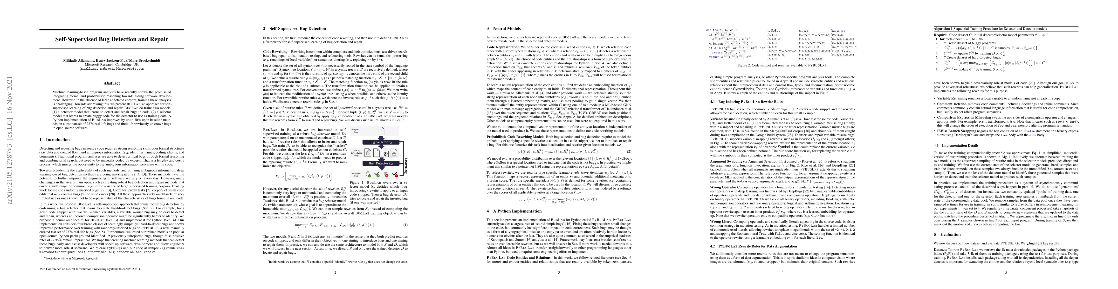 This paper introduces BugLab, a self-supervised learning method for detecting and repairing software bugs. It co-trains a detector and a selector model, achieving up to a 30% improvement over baselines and discovering 19 new bugs in open-source projects.