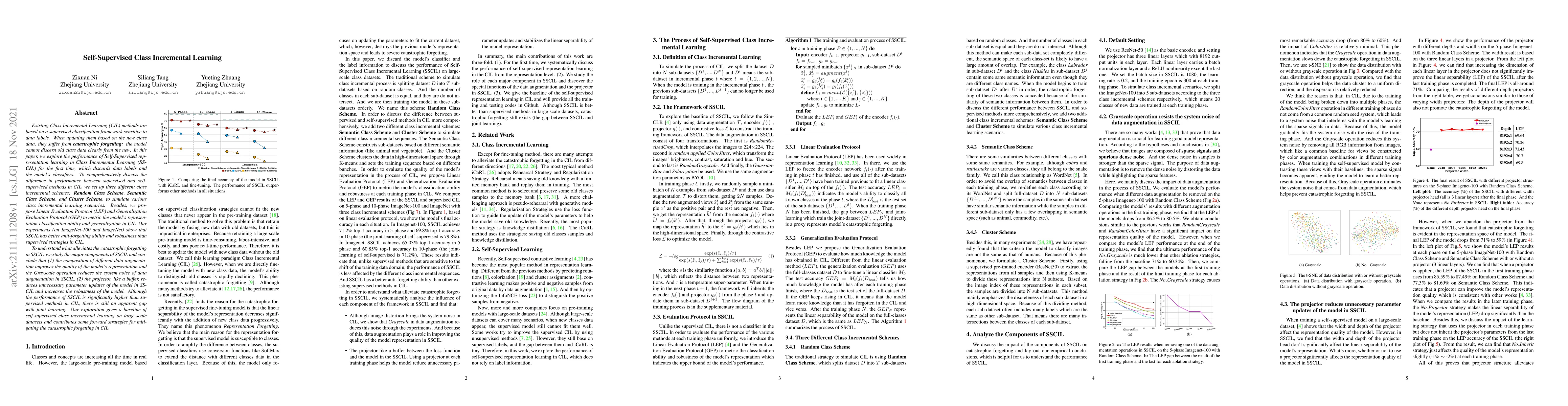 Existing Class Incremental Learning (CIL) methods are based on a supervised classification framework sensitive to data labels. When updating them based on the new class data, they suffer from catastrophic forgetting: the model cannot discern old class data clearly from the new. In this paper, we explore the performance of Self-Supervised representation learning in Class Incremental Learning (SSCIL) for the first time, which discards data labels and the model's classifiers. To comprehensively discuss the difference in performance between supervised and self-supervised methods in CIL, we set up three different class incremental schemes: Random Class Scheme, Semantic Class Scheme, and Cluster Scheme, to simulate various class incremental learning scenarios. Besides, we propose Linear Evaluation Protocol (LEP) and Generalization Evaluation Protocol (GEP) to metric the model's representation classification ability and generalization in CIL. Our experiments (on ImageNet-100 and ImageNet) show that SSCIL has better anti-forgetting ability and robustness than supervised strategies in CIL. To understand what alleviates the catastrophic forgetting in SSCIL, we study the major components of SSCIL and conclude that (1) the composition of different data augmentation improves the quality of the model's representation and the \textit{Grayscale} operation reduces the system noise of data augmentation in SSCIL. (2) the projector, like a buffer, reduces unnecessary parameter updates of the model in SSCIL and increases the robustness of the model. Although the performance of SSCIL is significantly higher than supervised methods in CIL, there is still an apparent gap with joint learning. Our exploration gives a baseline of self-supervised class incremental learning on large-scale datasets and contributes some forward strategies for mitigating the catastrophic forgetting in CIL.